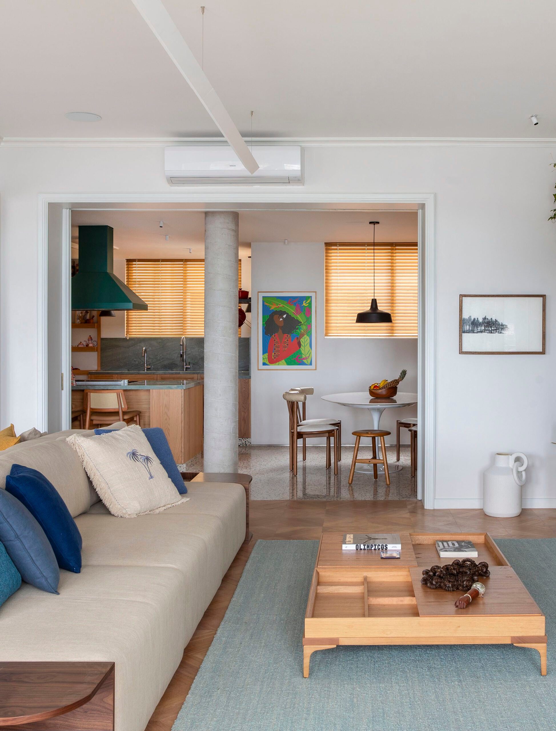 Na decoração, móveis assinados por designers brasileiros predominam nos ambientes. As obras de arte e objetos pessoais foram incorporados ao projeto, reforçando o vínculo afetivo com o espaço.