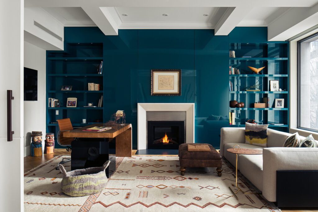 No escritório, a estante de laca azul brilhante se destaca. O tapete é de Fez, do Marrocos, e as almofadas tie-dye são da Way Design. Carrancas de Tiradentes, MG, completam o ambiente reforçando a essência brasileira.