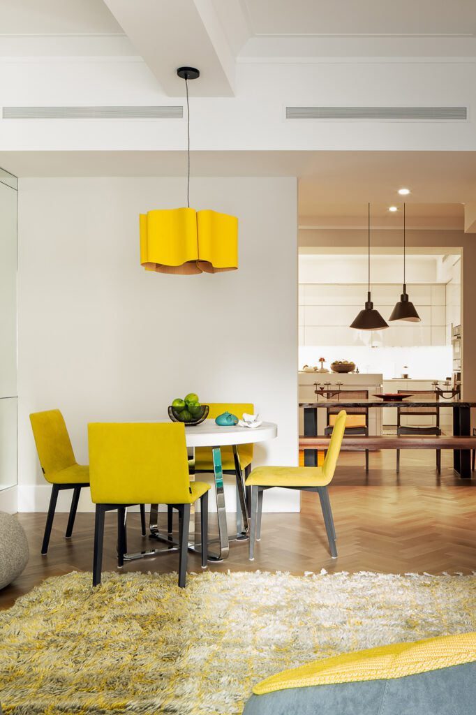 Ao lado do living, o family room é um espaço de convivência marcado pelas almofadas Livingstones, da Smarin Shop, poltronas amarelas Ligne Rosset e luminária Weplight, da Dimlux. Integrada ao ambiente, a sala de jantar foi ampliada na reforma, incorporando parte da cozinha. A mesa e as cadeiras são do acervo da família.