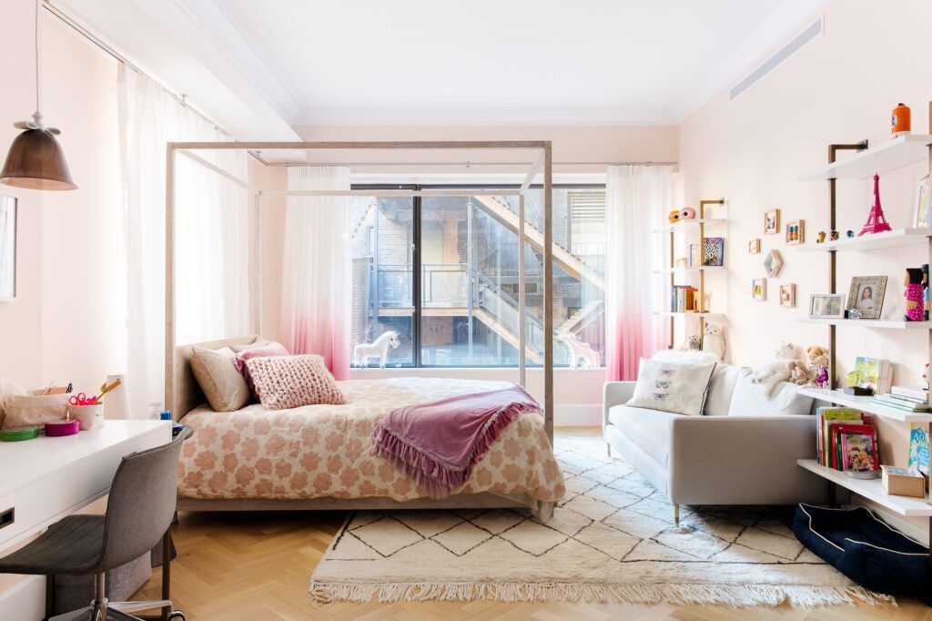 O quarto da filha une romantismo e modernidade. Paredes em rosa claro contrastam com cortinas tie-dye. A cama com dossel traz um design contemporâneo.