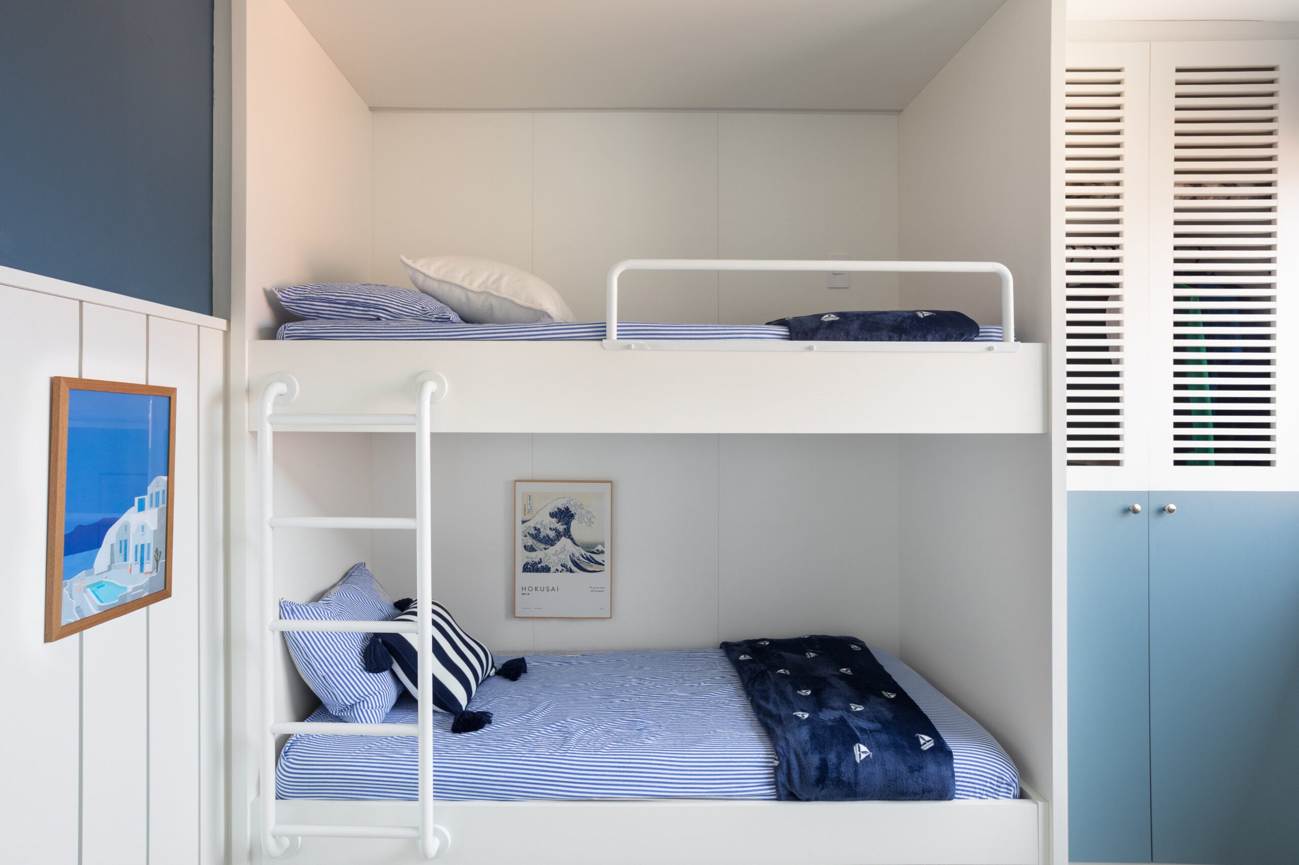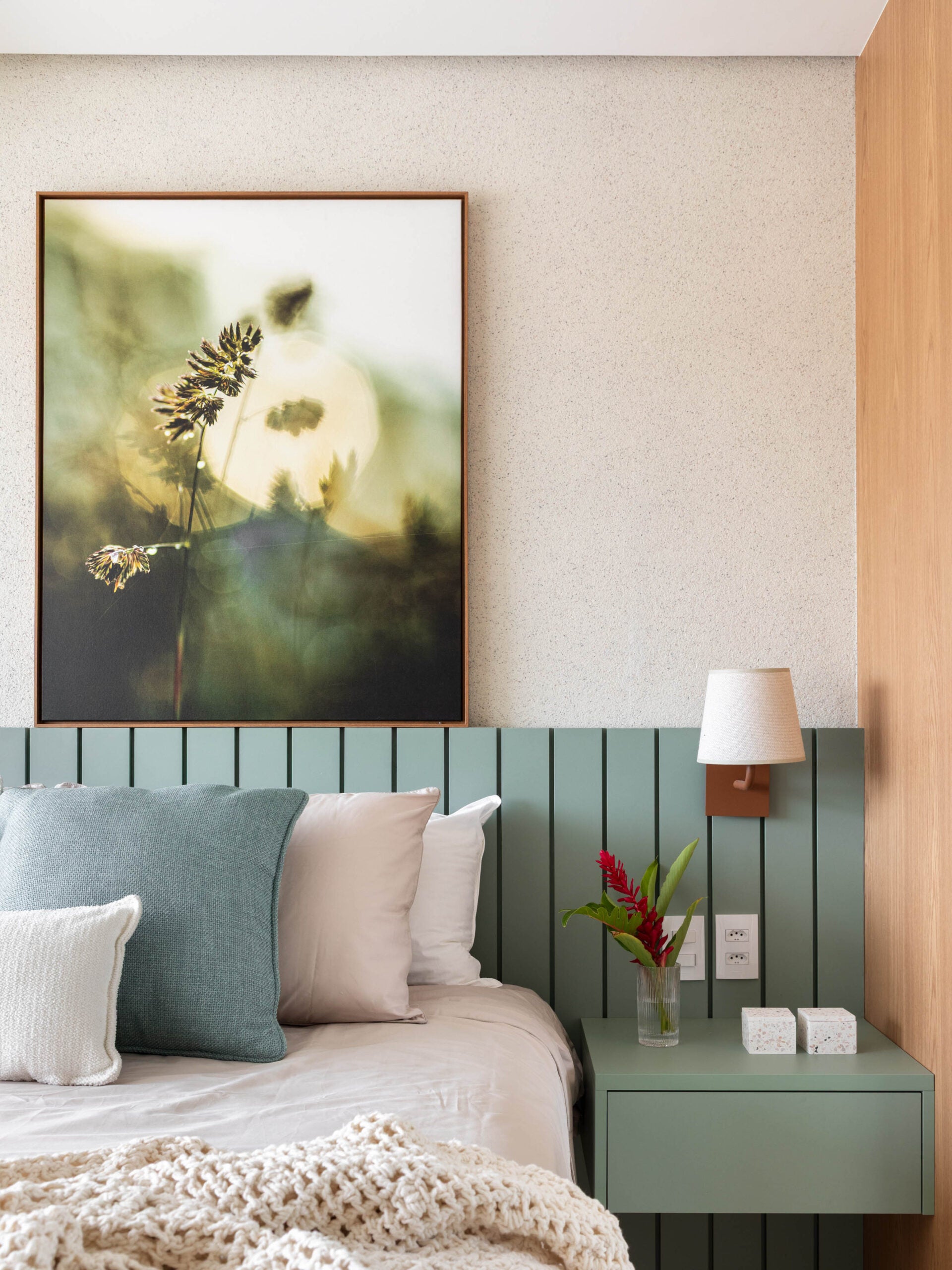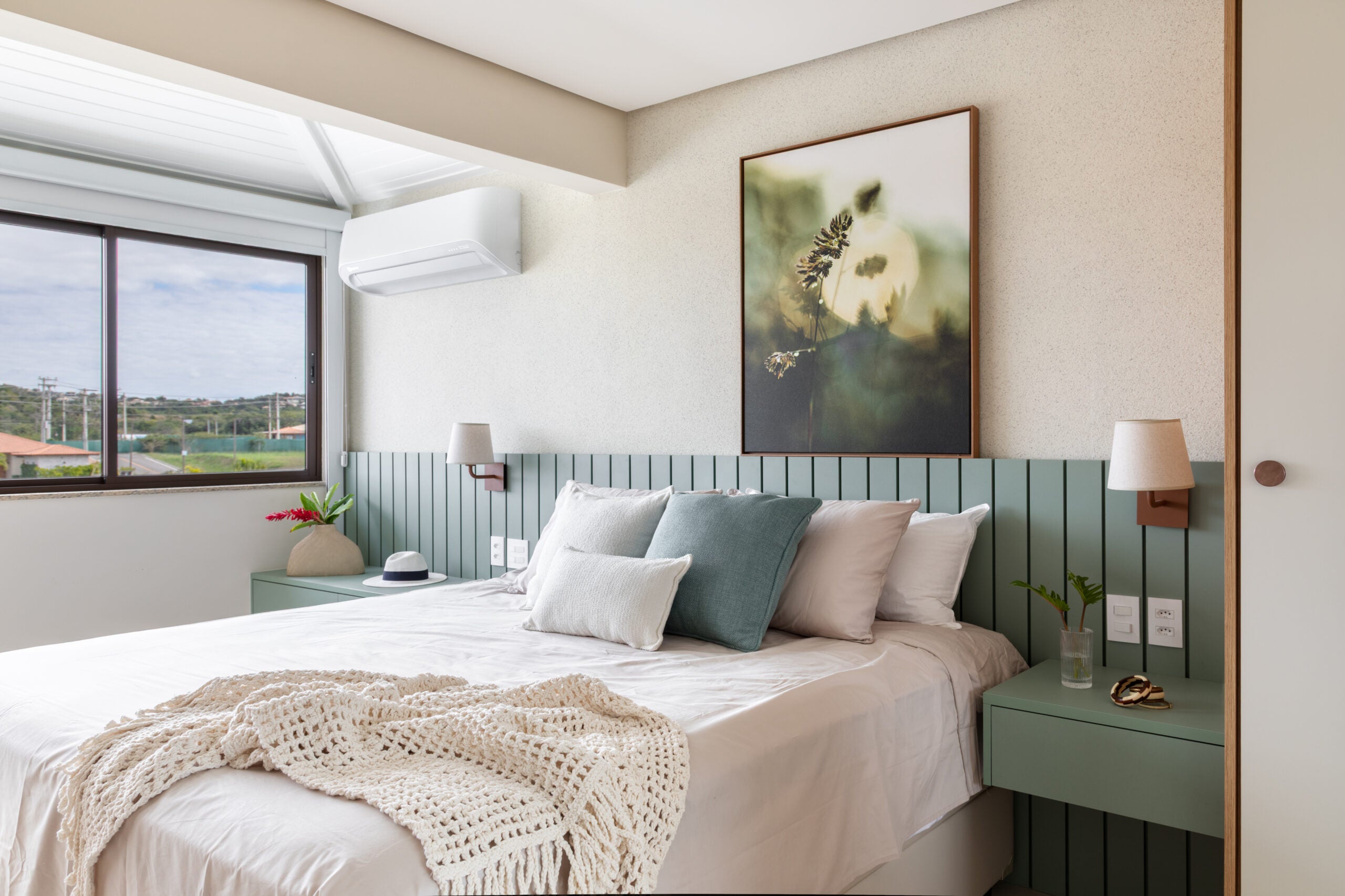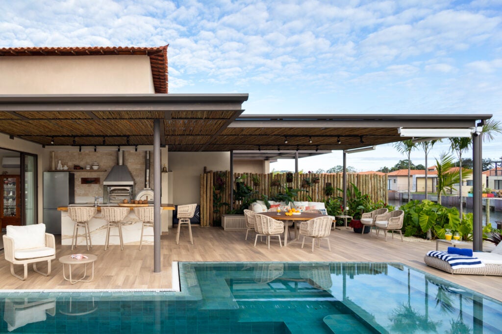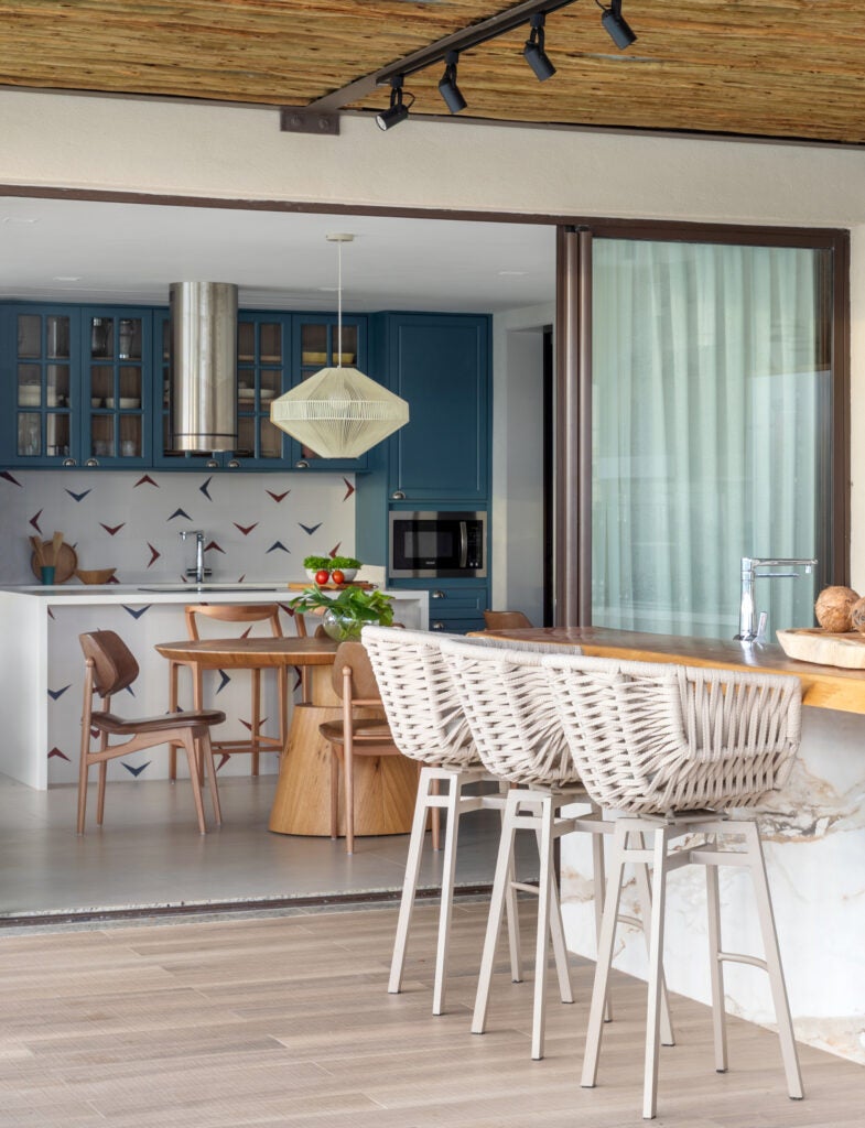 Toda a concepção do projeto foi guiada por uma leitura sensível do entorno. A atmosfera praiana se traduz no uso de materiais naturais, referências náuticas e uma paleta leve, que constroem uma experiência visual e sensorial coerente com a paisagem. Pérgolas de biriba, porcelanatos em tom de areia, pedras de seixos e textura Diore nas paredes reforçam a conexão com o ambiente externo. O azul aparece em pontos estratégicos, especialmente na cozinha, nos quartos e nos banheiros, dialogando com o mar e trazendo frescor aos ambientes. Em contraponto, toques de bordô surgem pontualmente, adicionando personalidade e descontração.