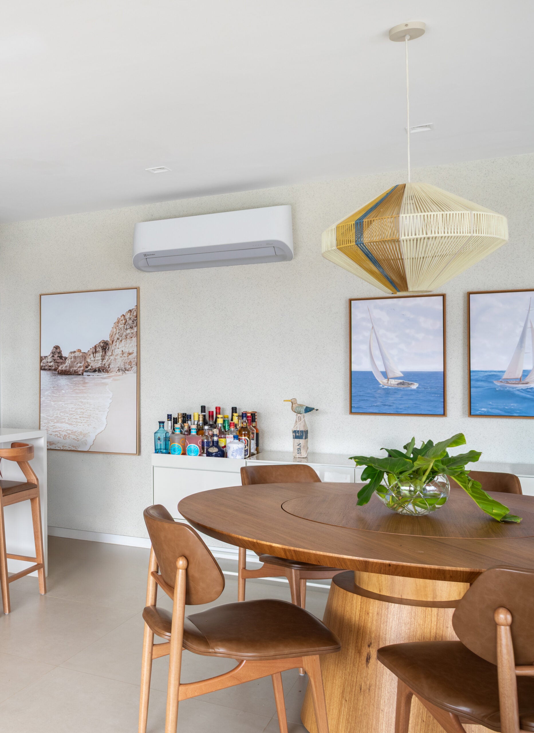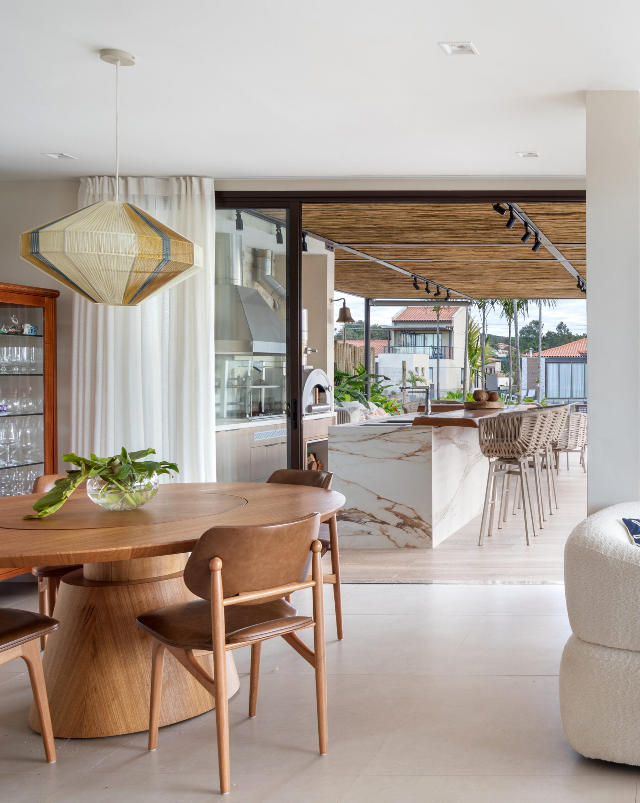 A decoração segue um estilo contemporâneo inspirado na natureza, com peças novas, resistentes e pensadas para o constante ir e vir entre piscina, mar e áreas sociais. Em meio a esse cenário, um elemento se destaca pelo valor simbólico: a cristaleira da sala de jantar, que originalmente era um guarda-roupa pertencente à avó da cliente. Restaurada e adaptada, a peça preserva a memória afetiva da família e introduz uma camada de história ao projeto, lembrando que casas também são feitas de narrativas.