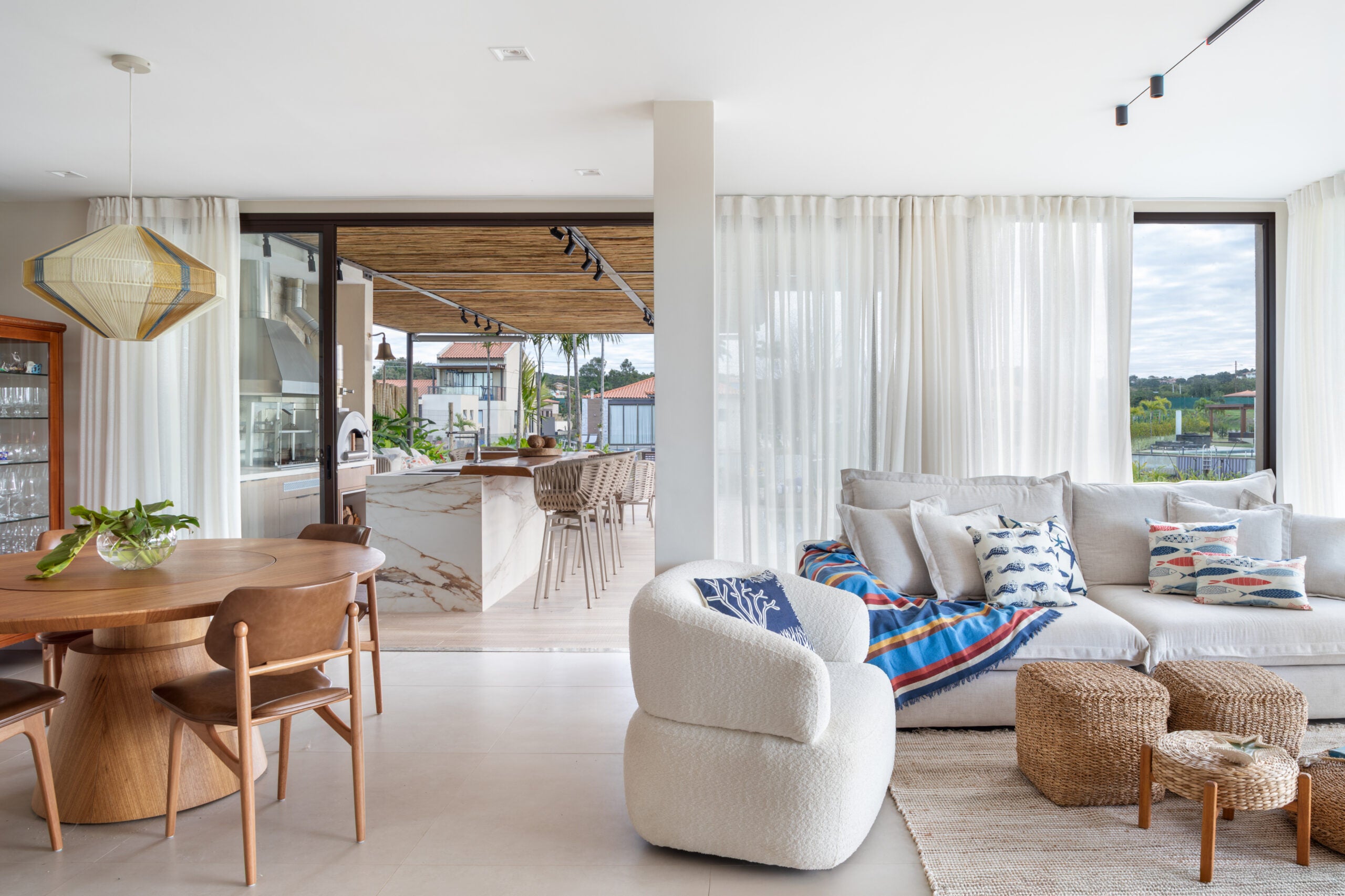 A marcenaria, toda desenhada pela arquiteta em padrão freijó, garante unidade visual aos espaços e introduz calor ao conjunto. Já as cortinas brancas em poliéster com algodão filtram a luz de forma suave, contribuindo para a sensação de leveza que atravessa toda a casa.