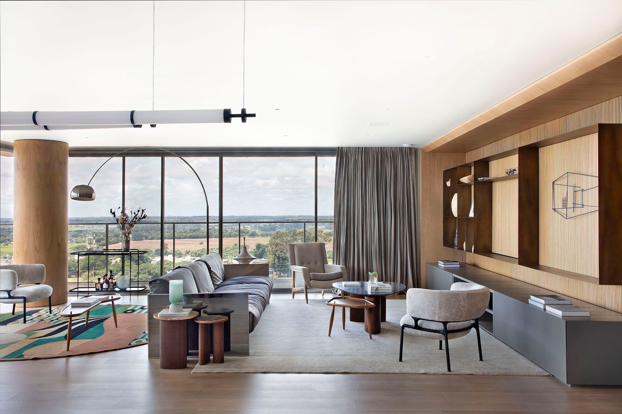 A decoração, assinada pela própria moradora, a designer Danielle Freitas, mescla móveis novos com peças reaproveitadas da antiga residência. Entre os destaques, as cadeiras Curva, originais dos anos 1960 e assinadas por Joaquim Tenreiro, completam a ambientação com personalidade.