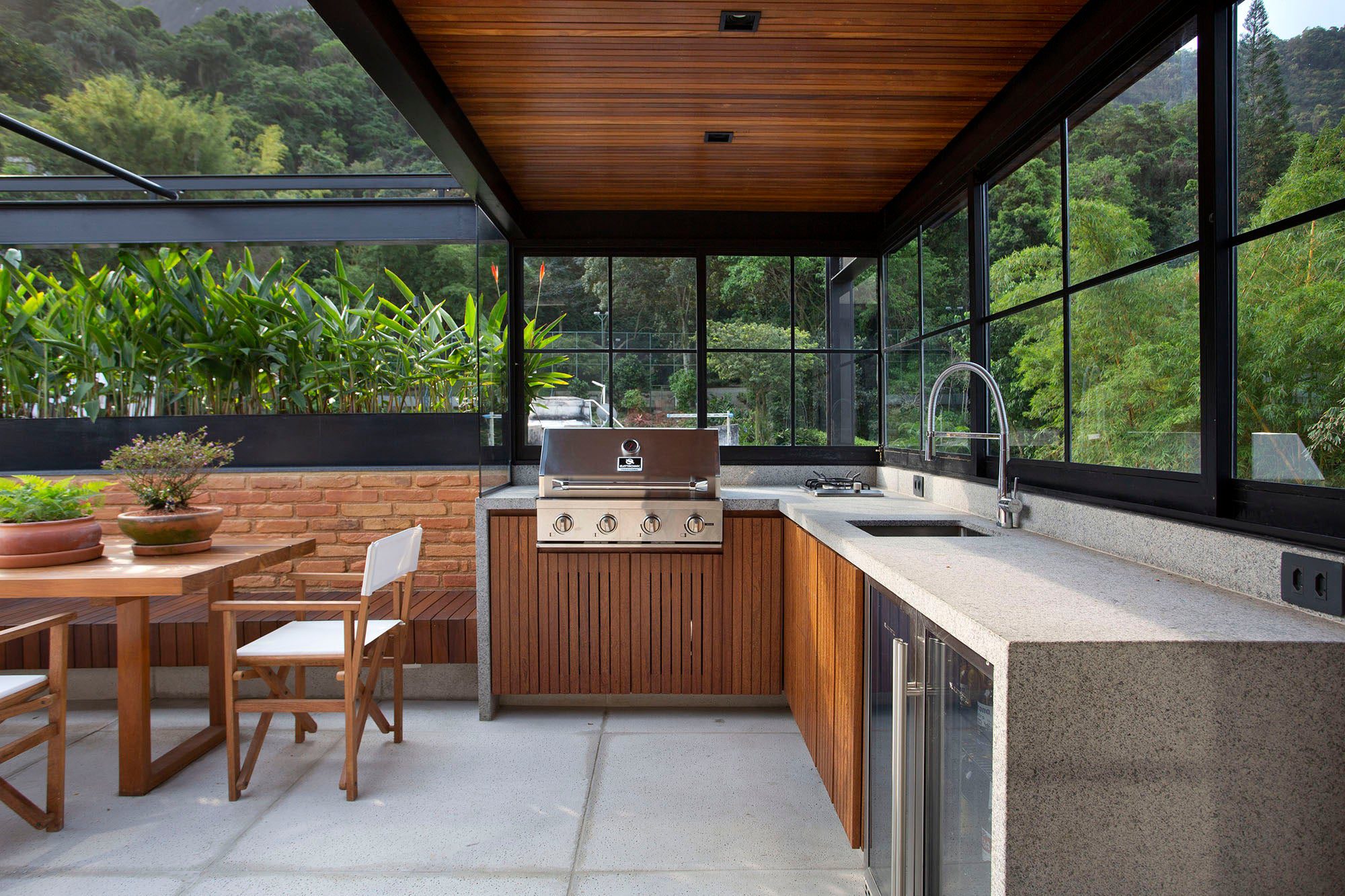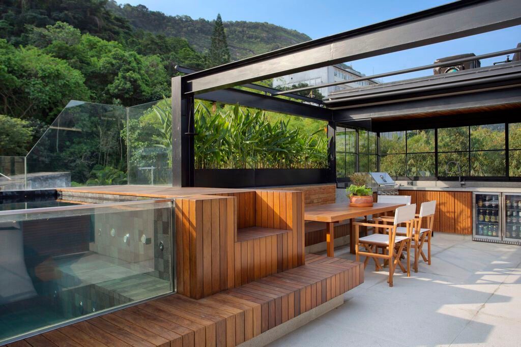 A cobertura abriga os espaços de lazer, com churrasqueira, mesa de refeições, teto retrátil e uma piscina com borda de vidro.