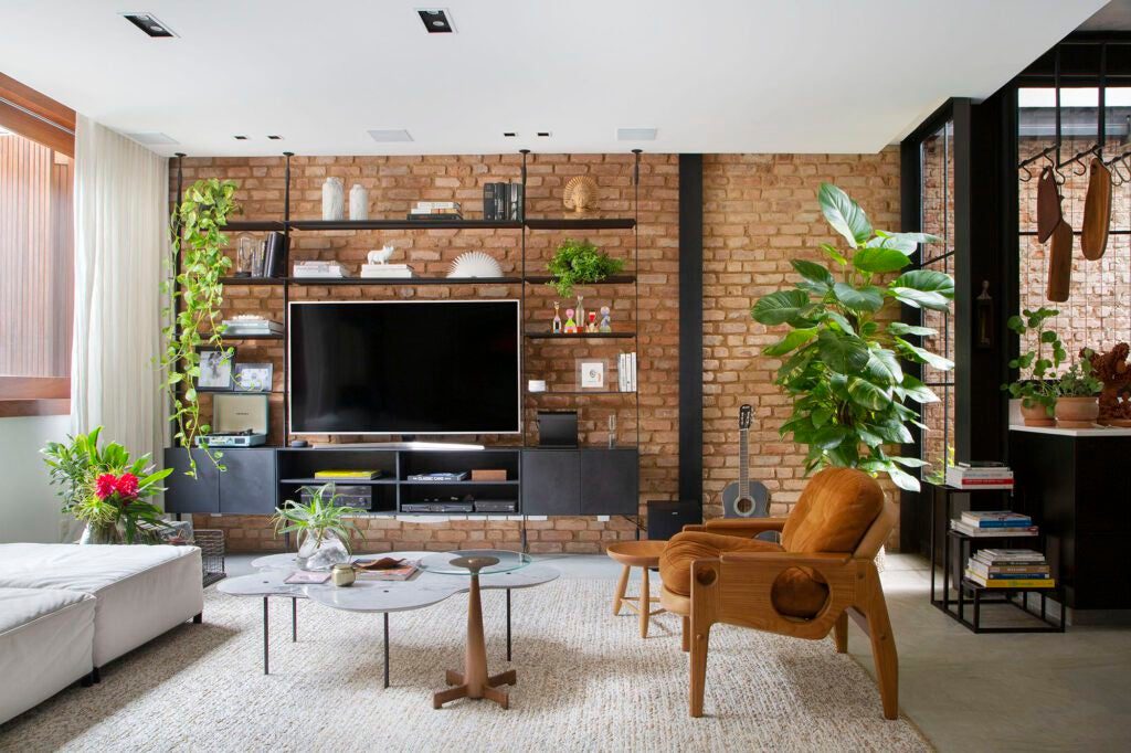 A parede de tijolinhos reaproveitados da antiga casa traz memória e aquece a paleta neutra. A poltrona Tetê, os bancos Marcos e Mocho, de Sergio Rodrigues, e a estante Icon, de Jader Almeida, reforçam o caráter autoral do décor.
