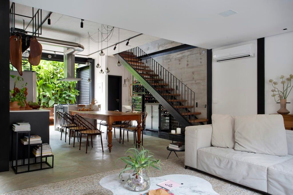 O piso de cimento queimado completa a base do térreo, reforçando a linguagem industrial da residência.