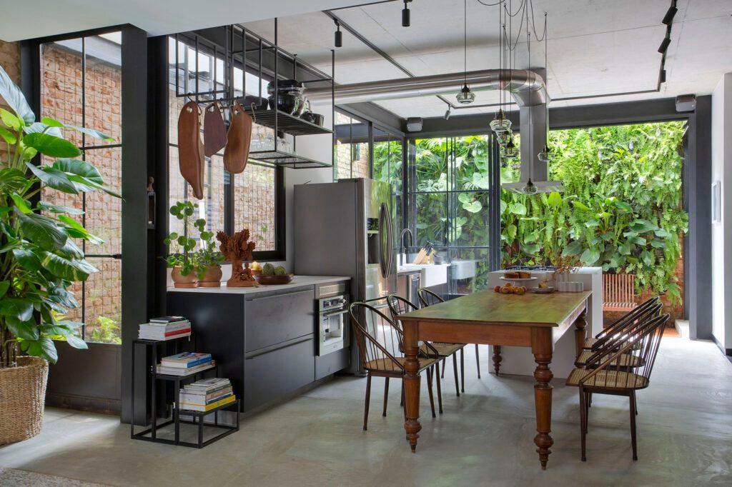 No térreo, sala, cozinha e jardim de inverno foram integrados para ampliar a sensação de espaço e promover o convívio familiar.
