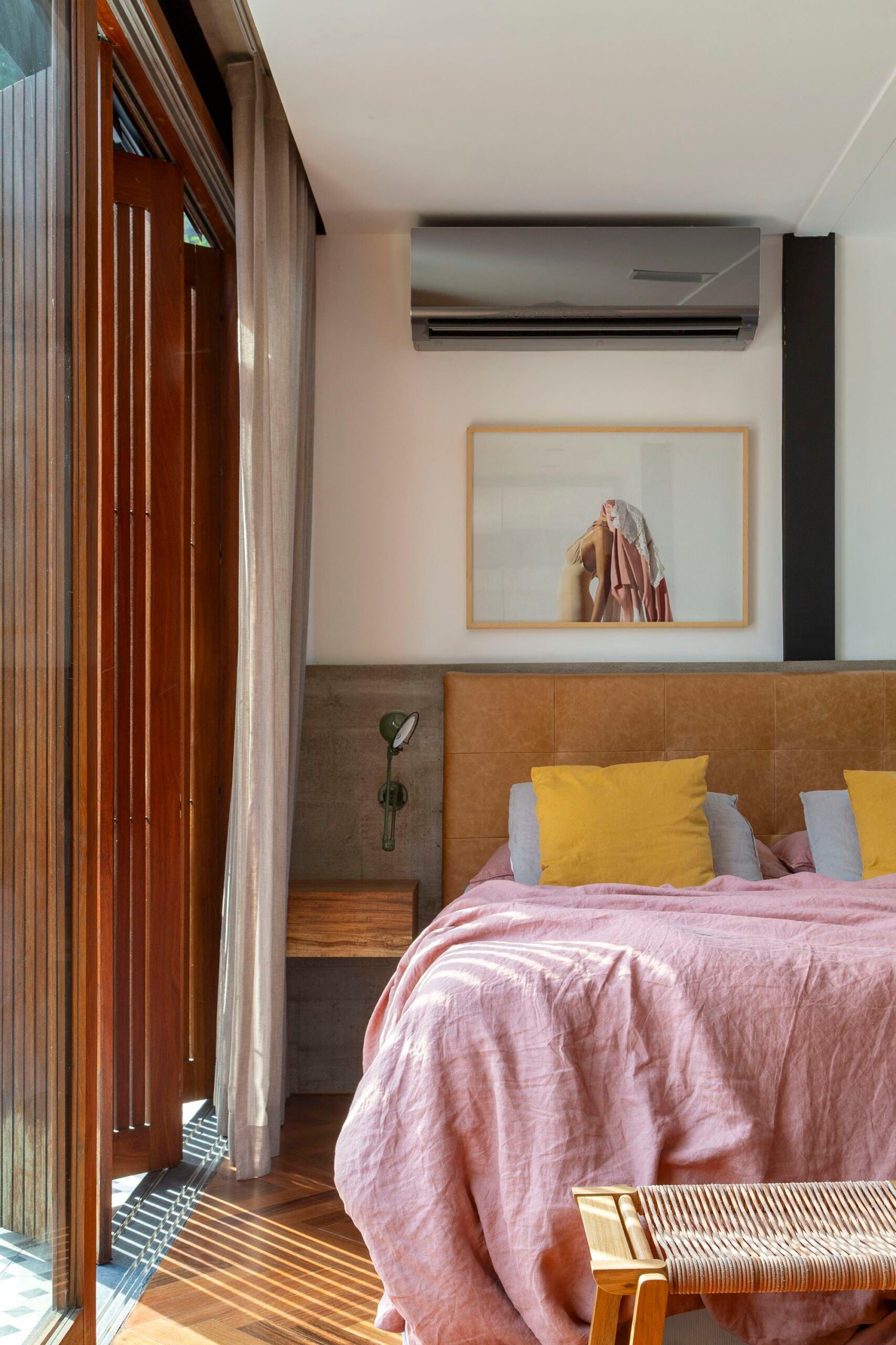 O segundo andar abriga os quartos dos filhos, enquanto o terceiro pavimento foi inteiramente dedicado à suíte master, com dormitório, closet e banheiro integrados em um espaço amplo e iluminado. Na área íntima, o piso de tacos de madeira, paginado em espinha-de-peixe, adiciona acolhimento e remete às casas tradicionais brasileiras.
