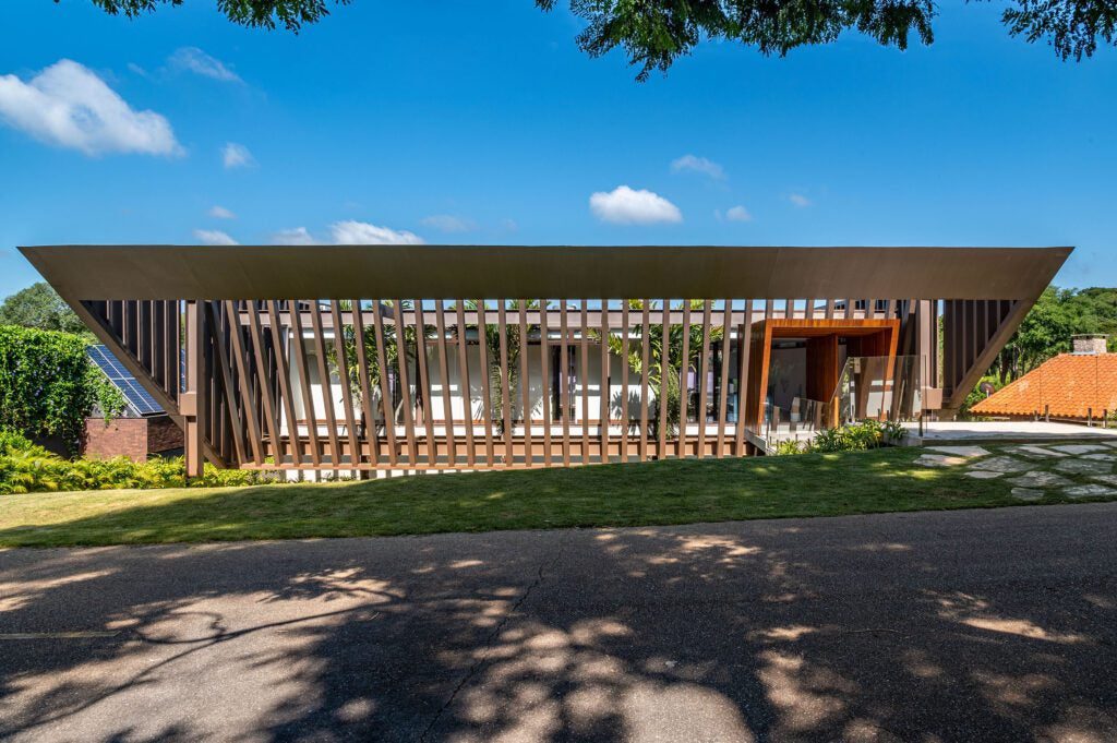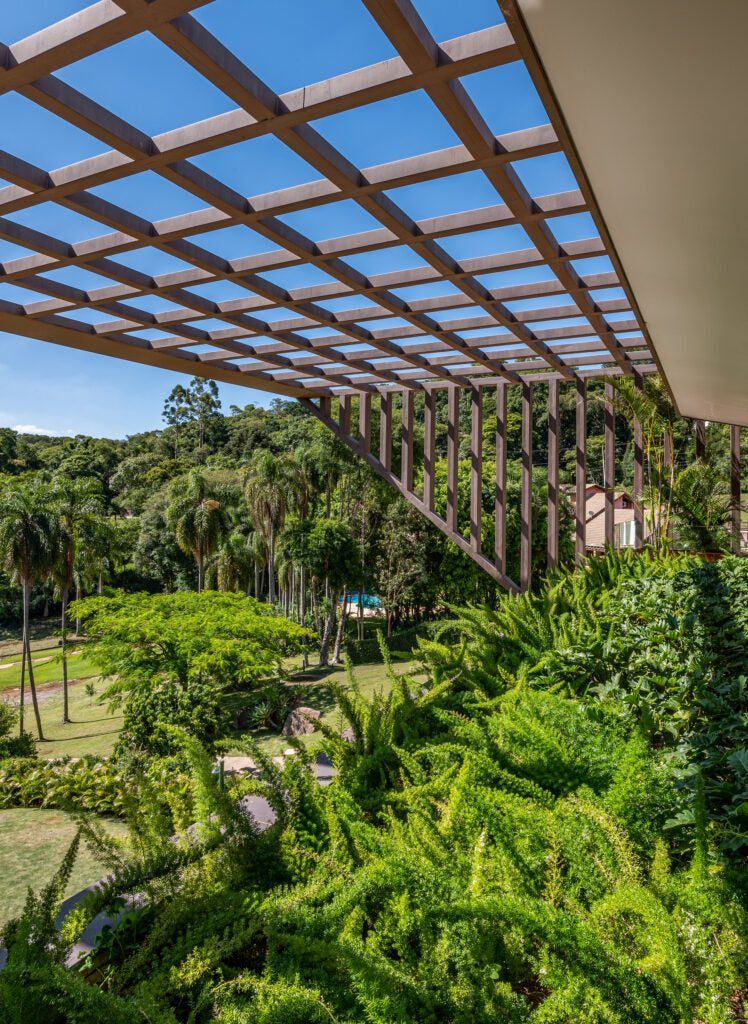 A preservação da topografia, com seus 13 metros de declive, assegurou a integração natural da construção à paisagem.