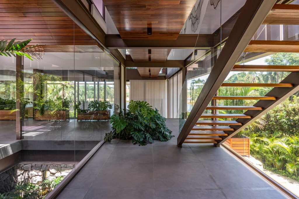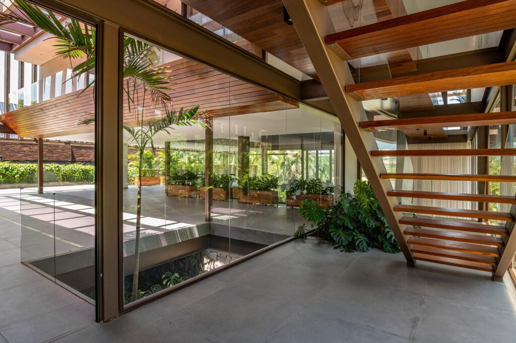 As grandes paredes de vidro permitem total visibilidade da paisagem circundante, além de proporcionar abundante iluminação natural.