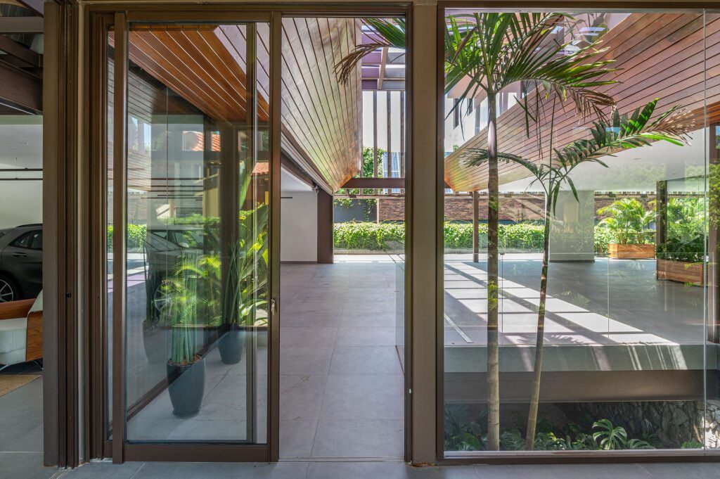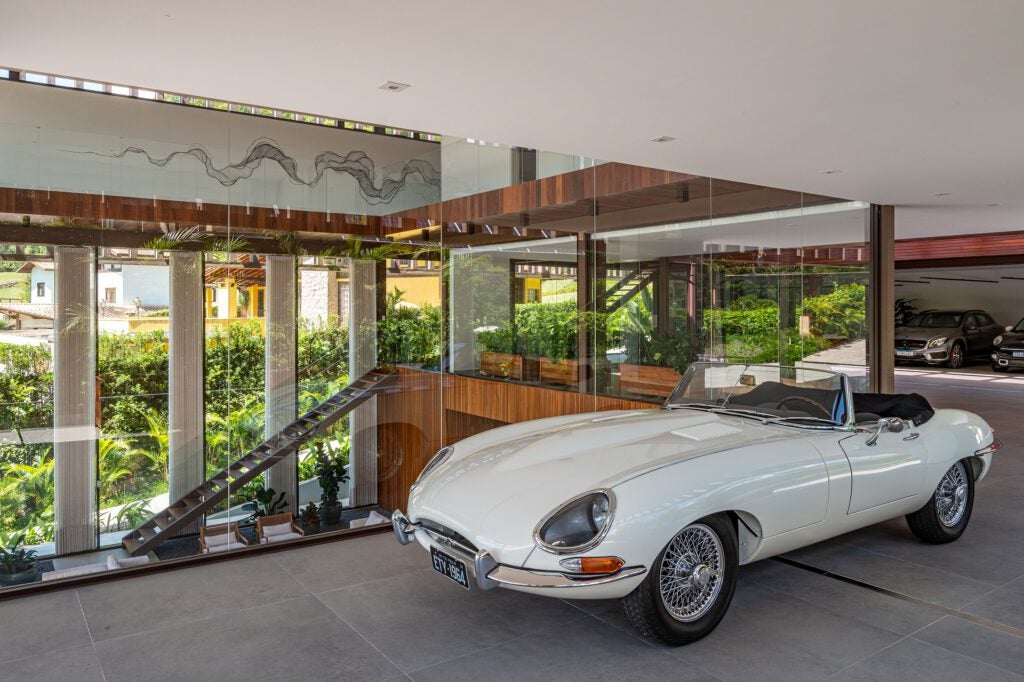 A garagem para a coleção de carros, situada no pavimento inferior, foi desenhada para permitir a apreciação dos veículos tanto do hall de entrada quanto da área social. Um pátio para visitantes complementa o espaço, trazendo praticidade e sofisticação.