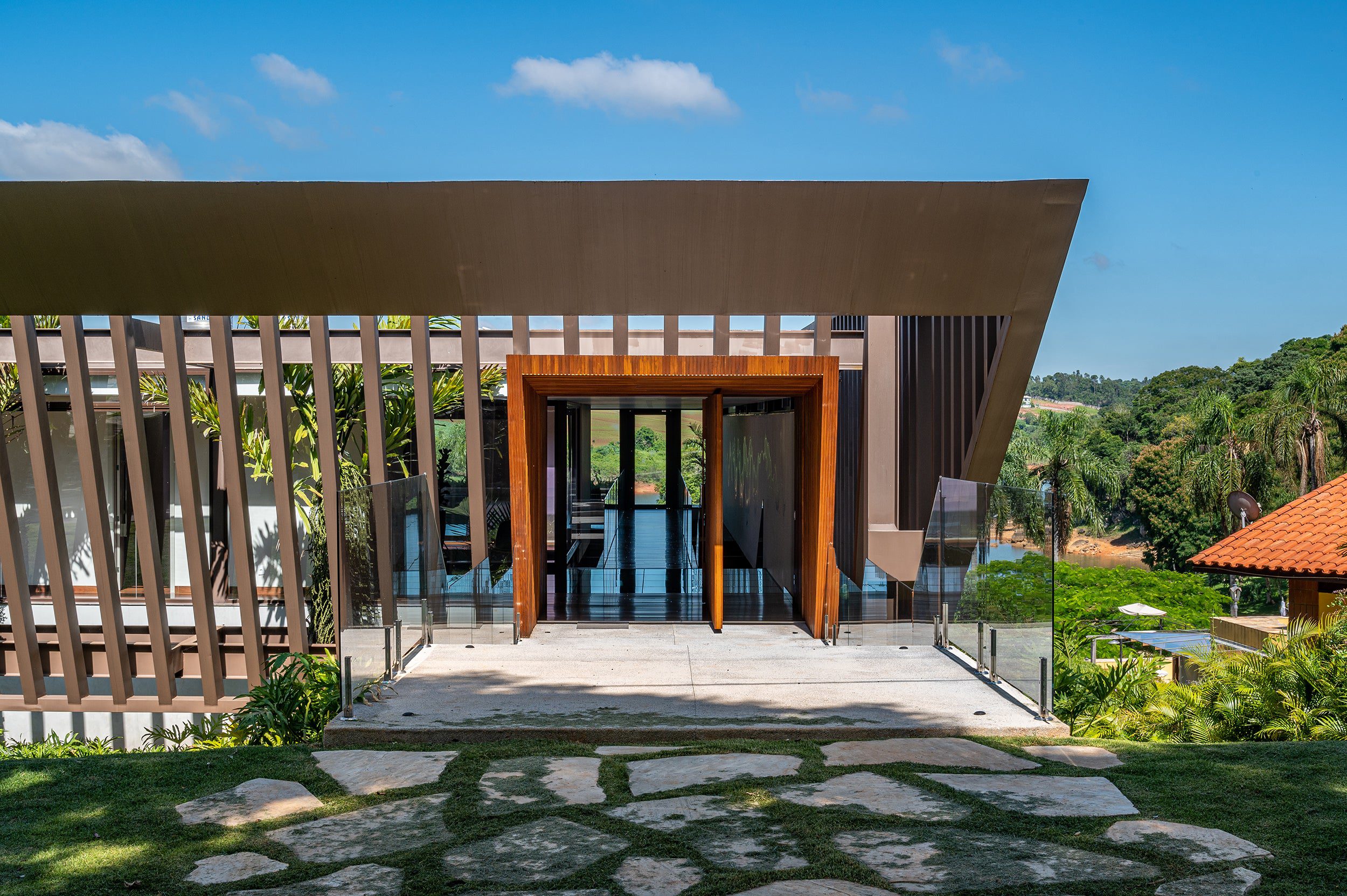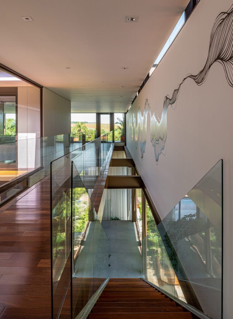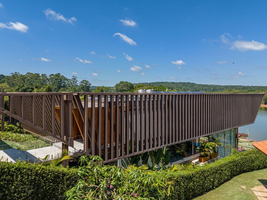 A passarela suspensa flutua sobre o pé-direito de 13 metros, conduzindo os moradores a uma sequência de suítes e ao mirante, onde a vista da represa se destaca.