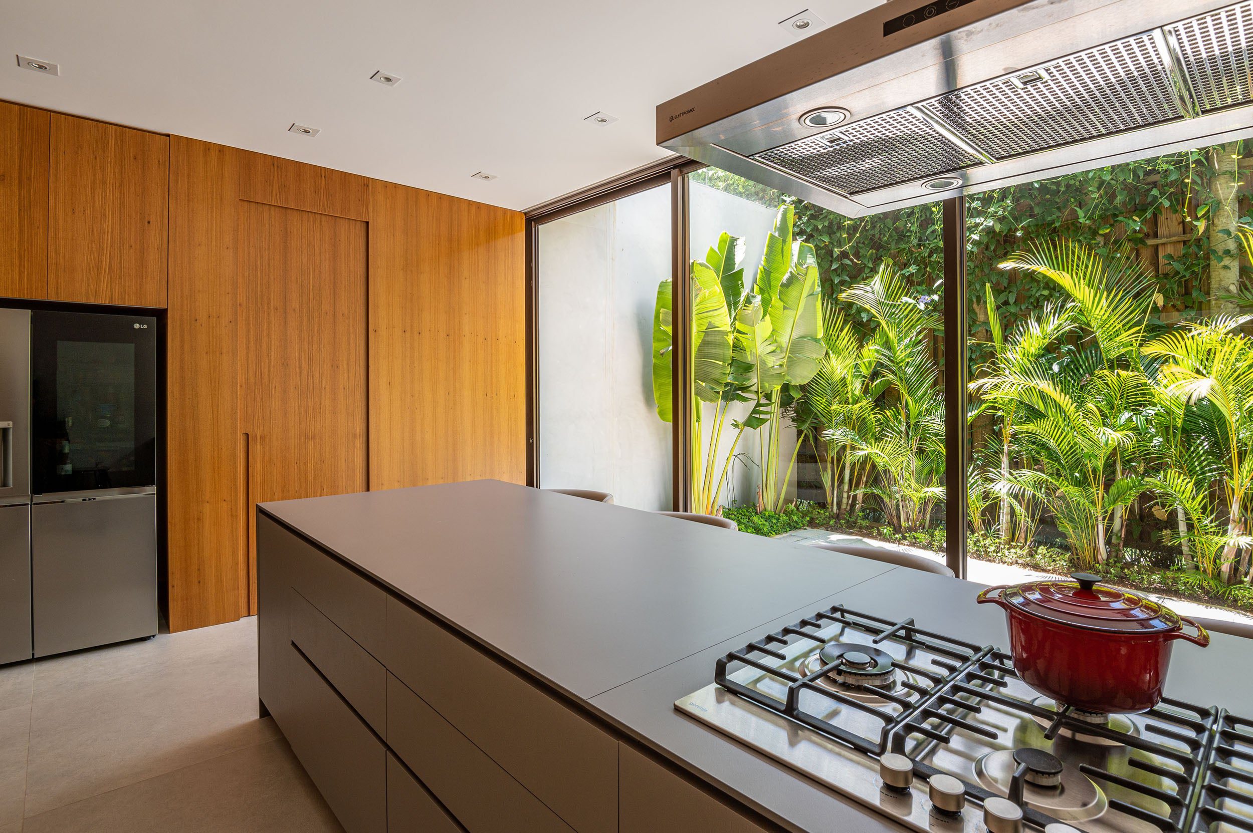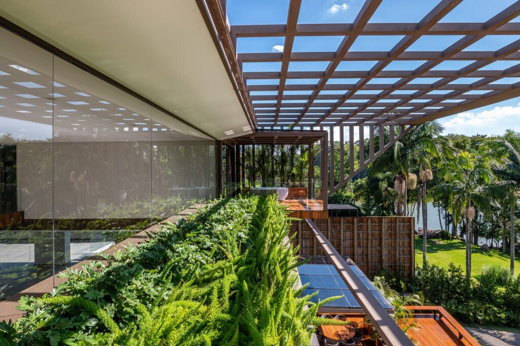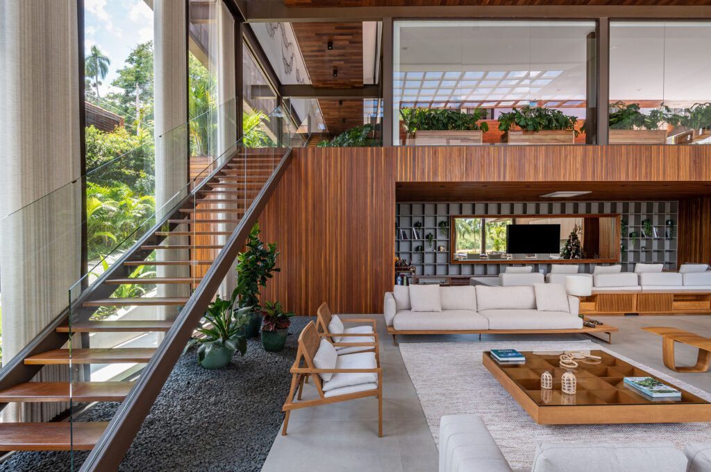O paisagismo, assinado por Samira Salvetti, complementa o cenário, reforçando a atmosfera tranquila da residência.