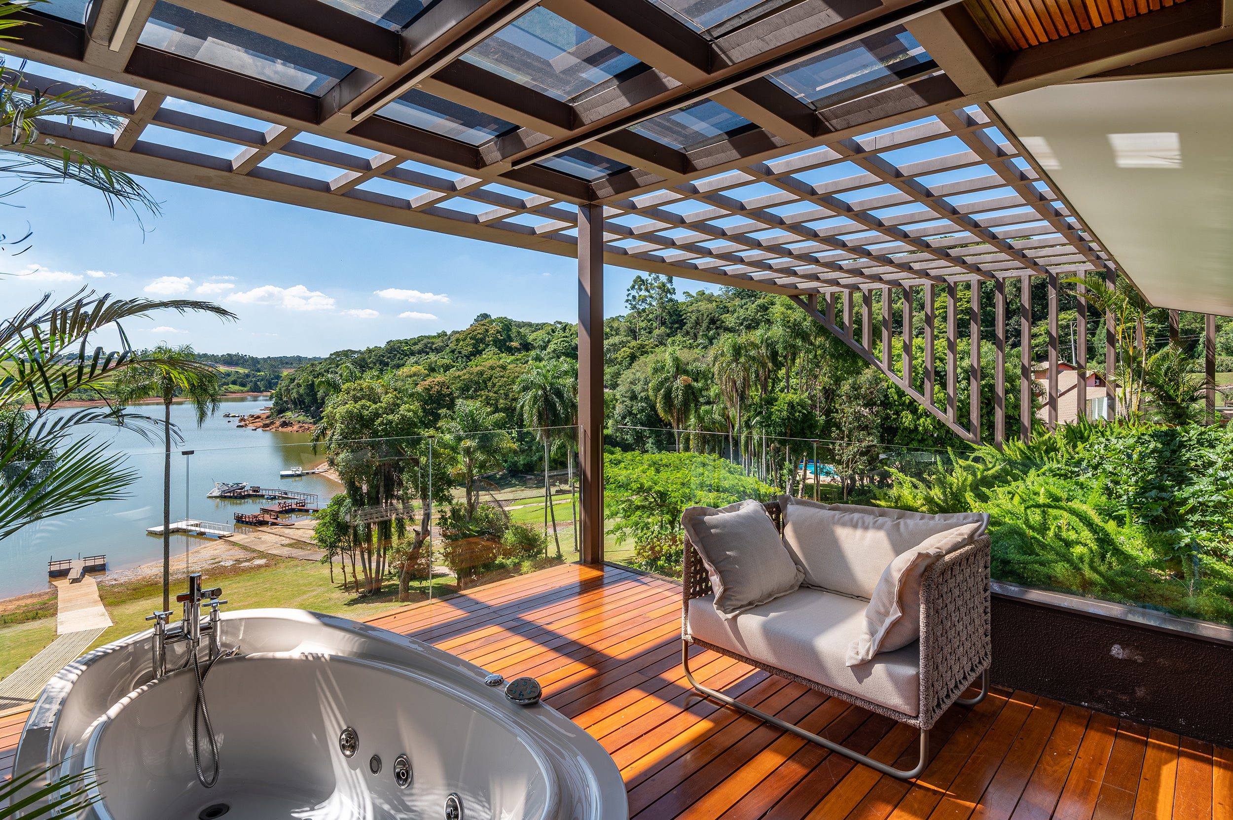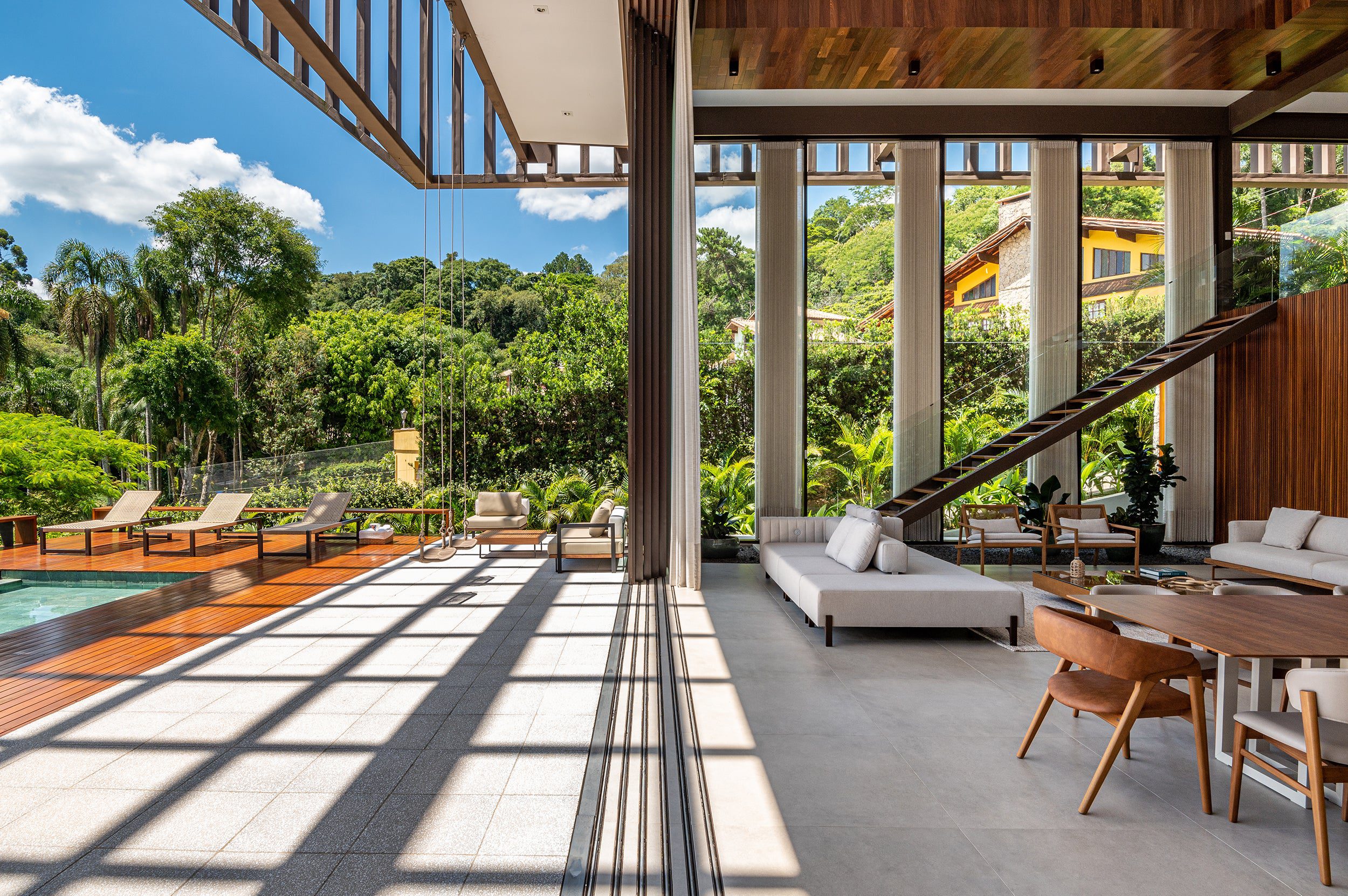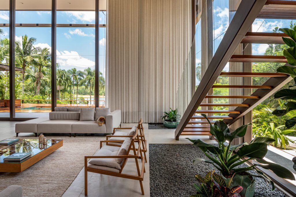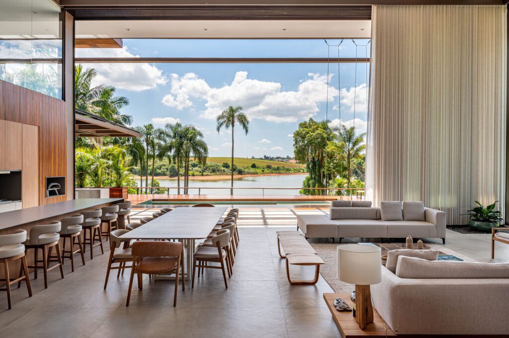Na área social, uma imponente porta com 13 metros de largura e 7 metros de altura, dividida em cinco folhas, conecta a sala de estar e o espaço gourmet à paisagem da represa.