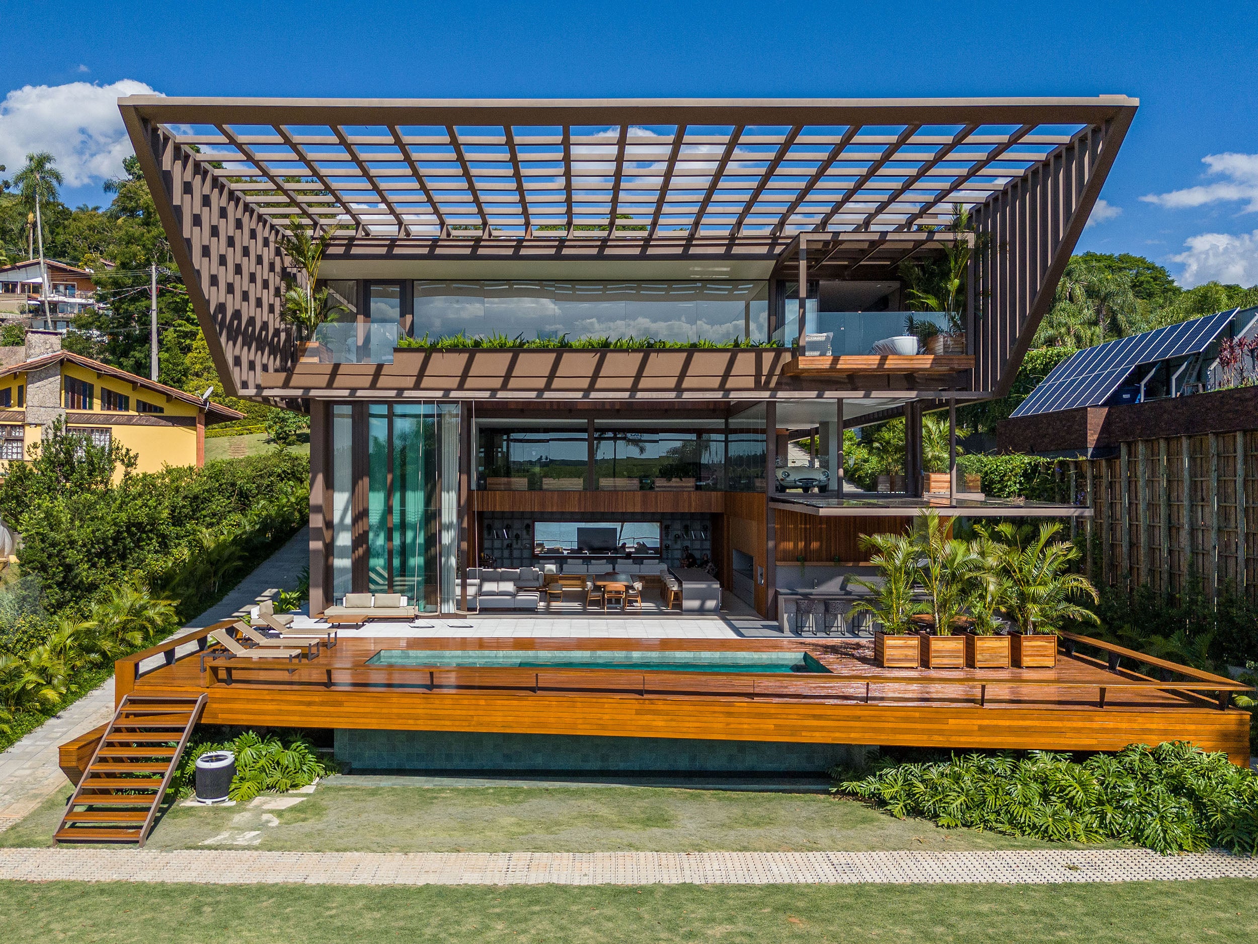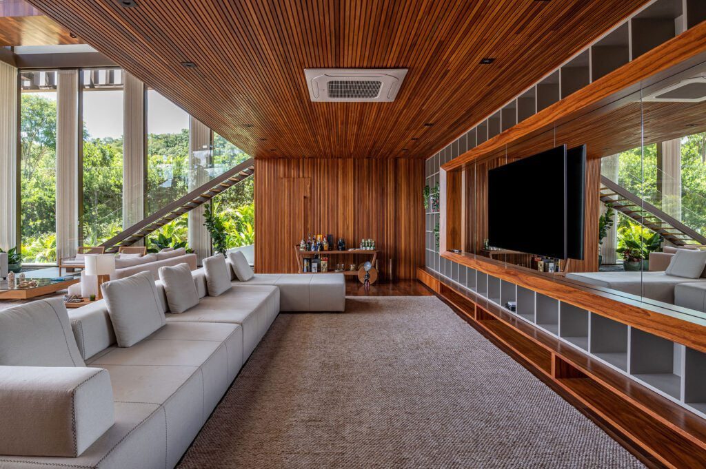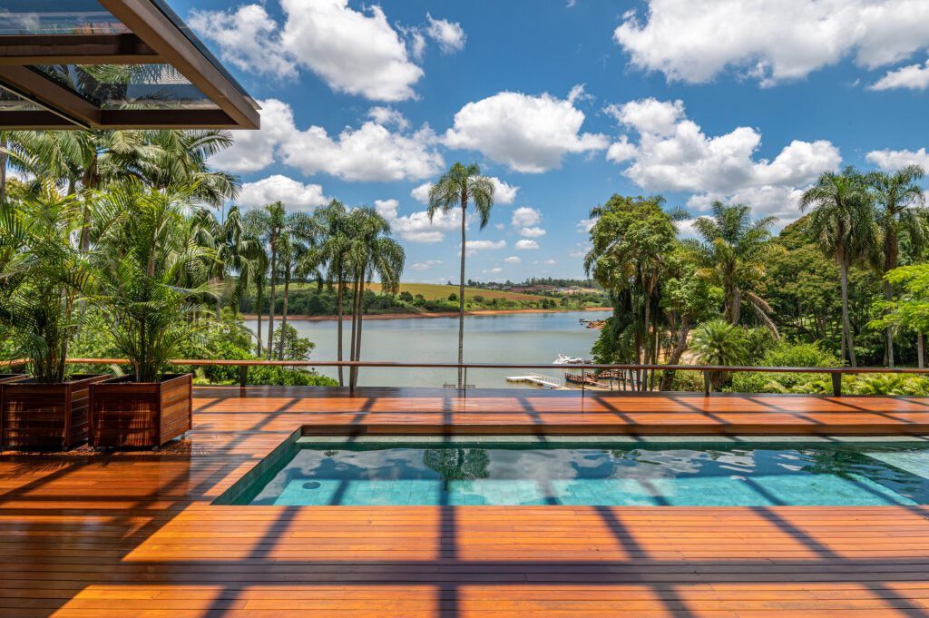A sala de TV, com espelhos aplicados, cria uma ilusão de continuidade com a água, enquanto a piscina de borda infinita e o deck são ideais para receber amigos.