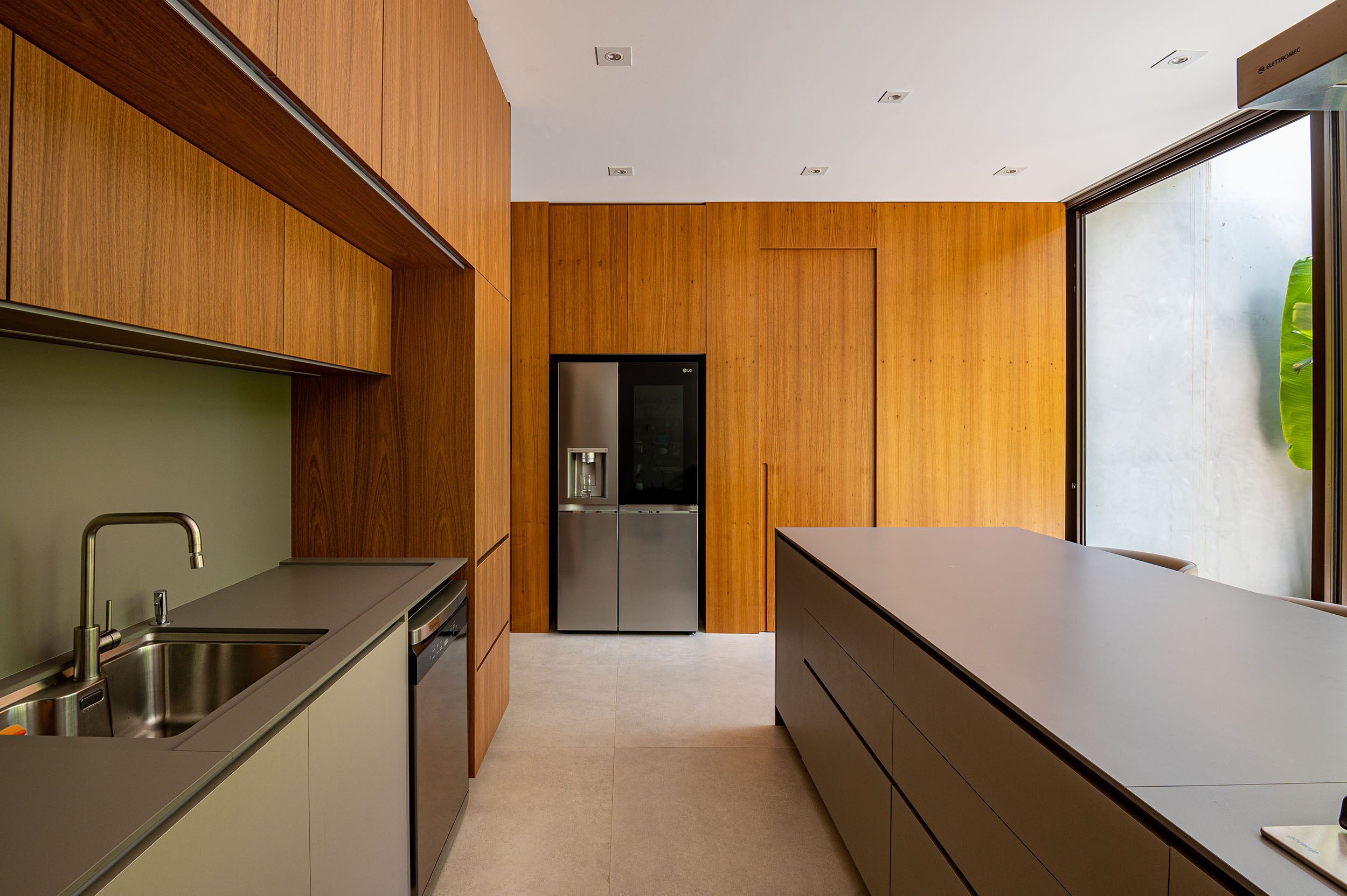 As fachadas e a estrutura são todas de metal, com caixilhos e portas em alumínio marrom que se harmonizam com o conceito geral da residência.