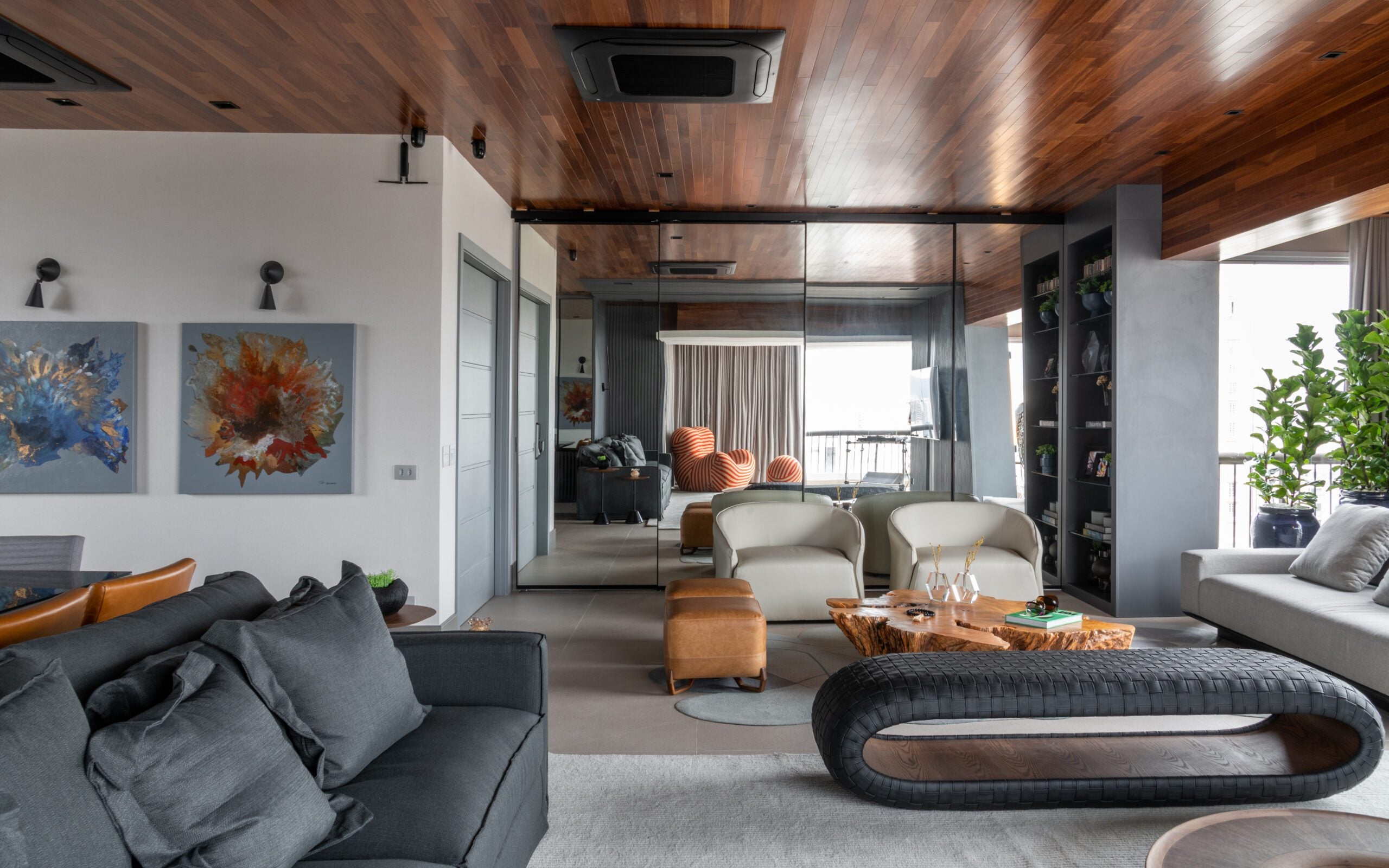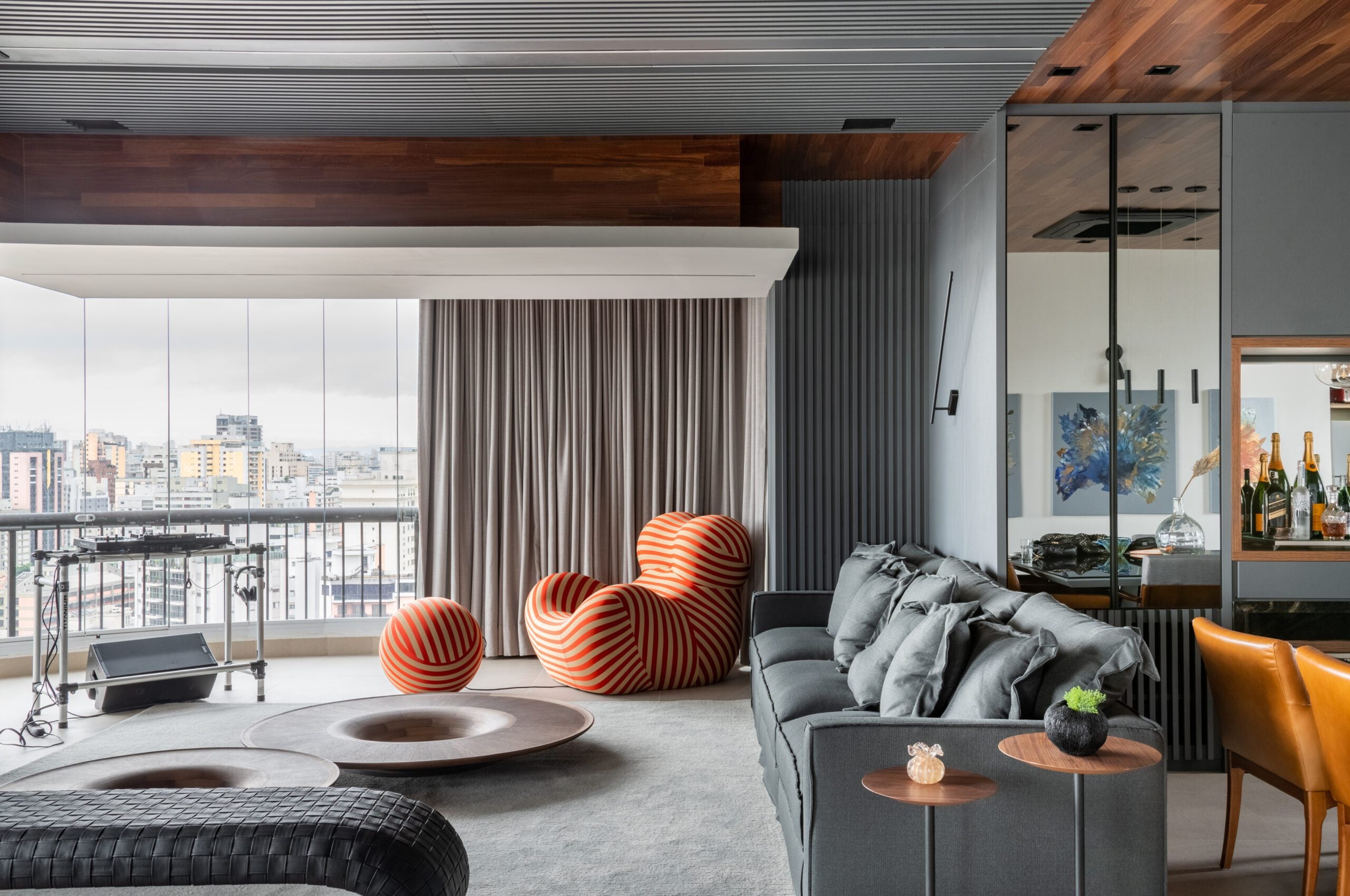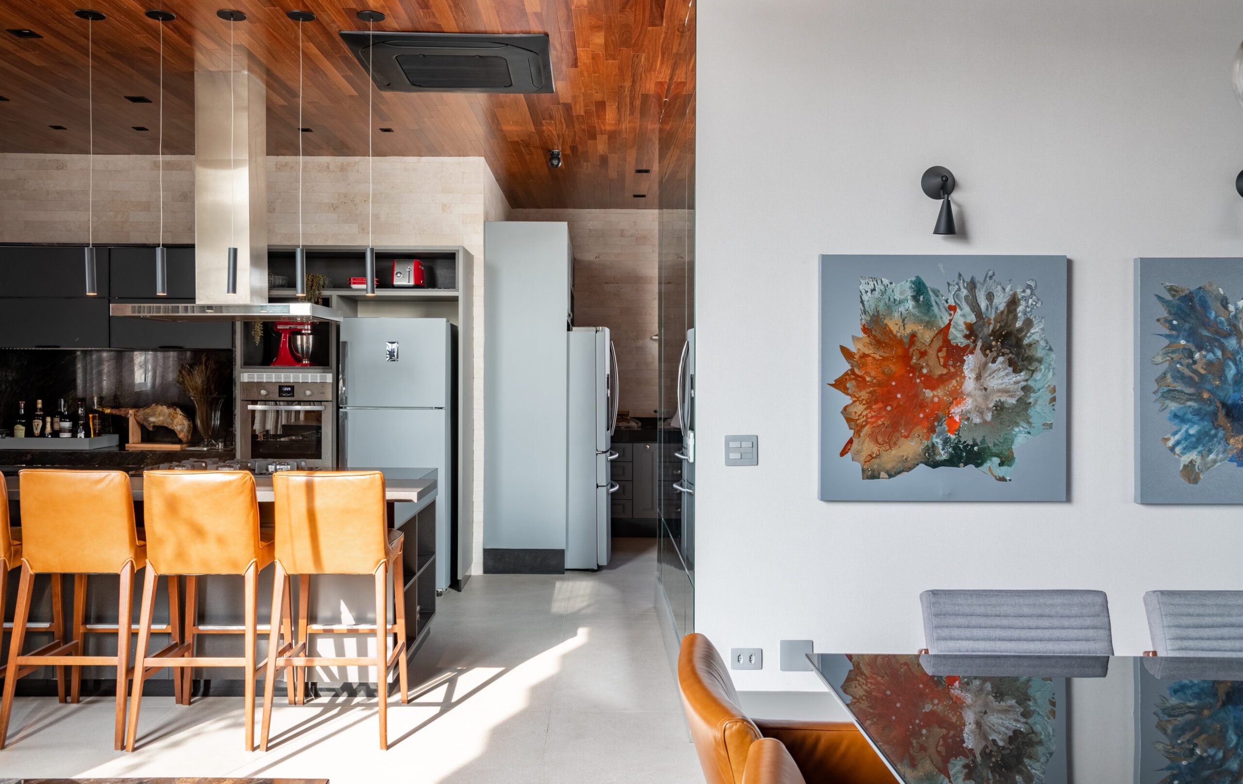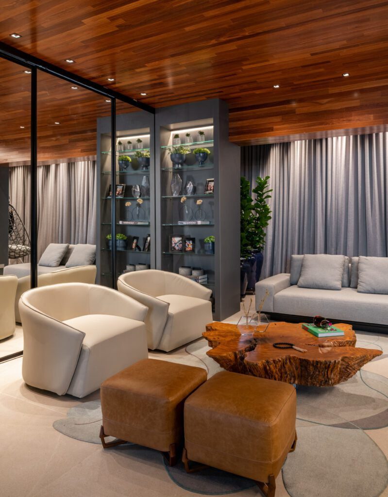 O teto em madeira, combinado ao piso em tom de concreto, trouxe aconchego e sofisticação, reforçando o contraste com elementos mais sóbrios como a escada em pedra Matrix Gold e o tijolinho aparente da cozinha. O décor valoriza peças assinadas, como a icônica poltrona Up de Gaetano Pesce, as mesas Twist e o banco Cheig de Jader Almeida, além dos quadros de Rita Duarte, que dialogam com a atmosfera contemporânea do espaço.