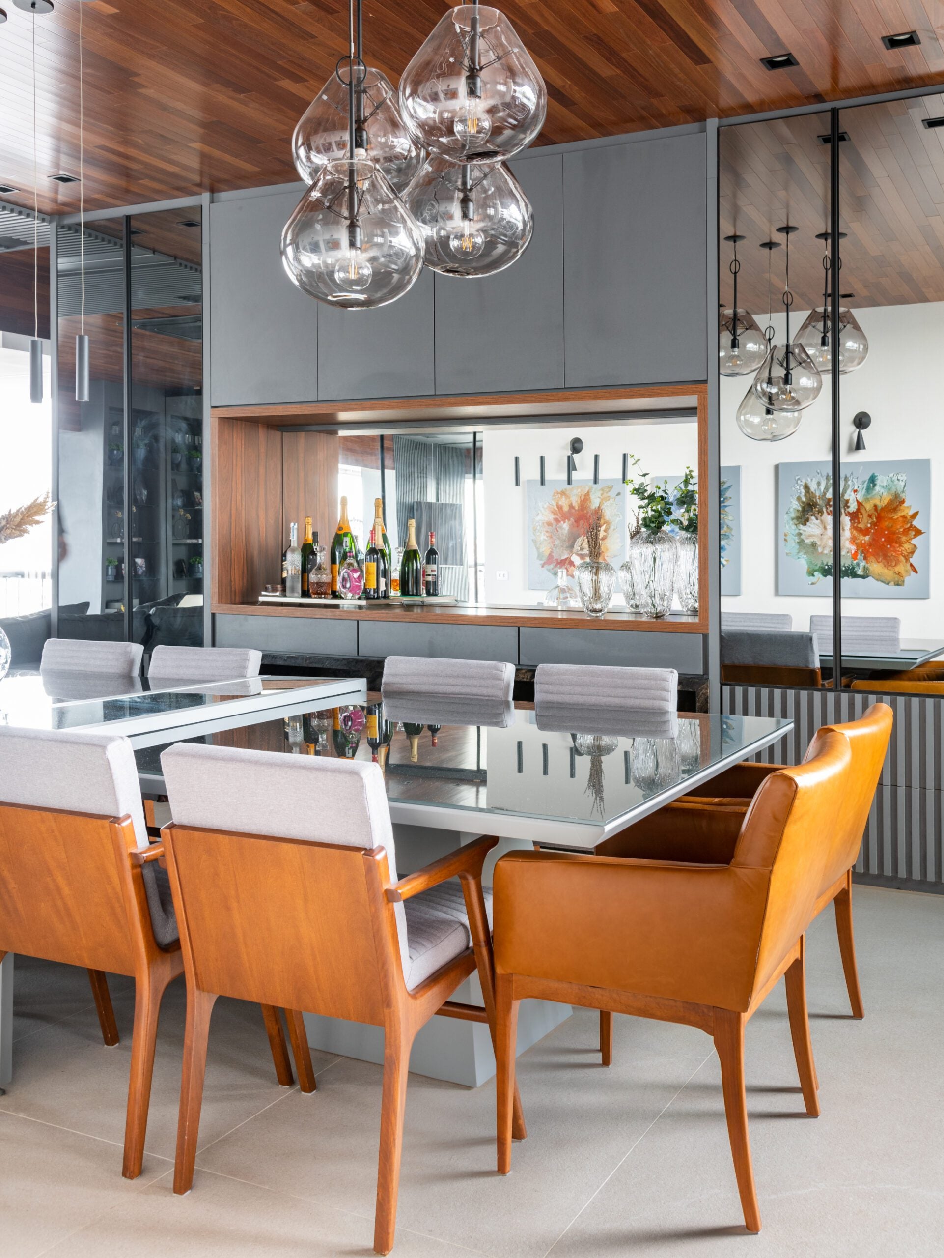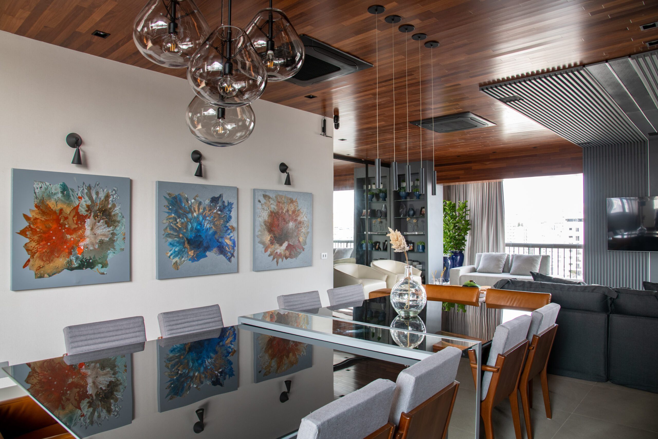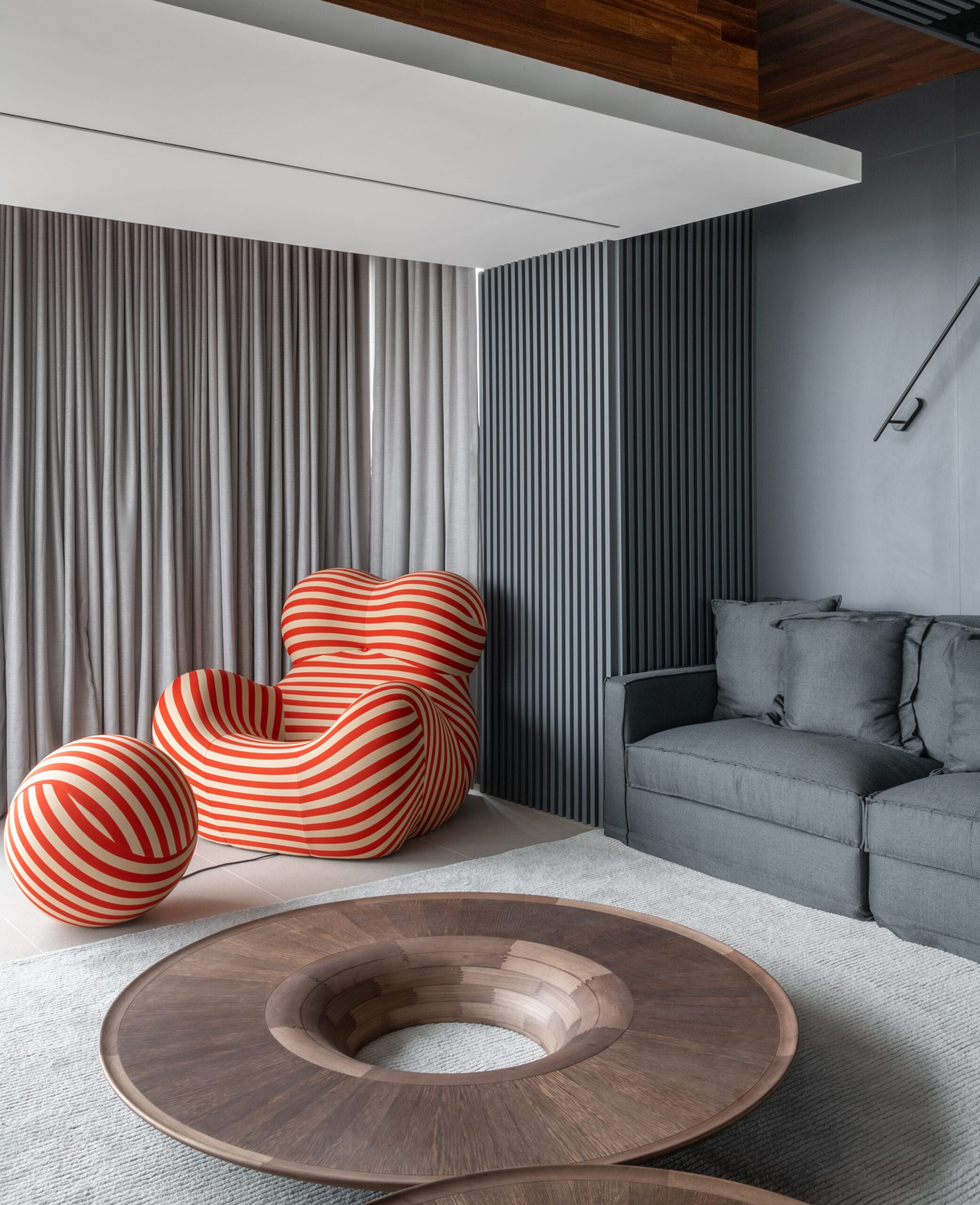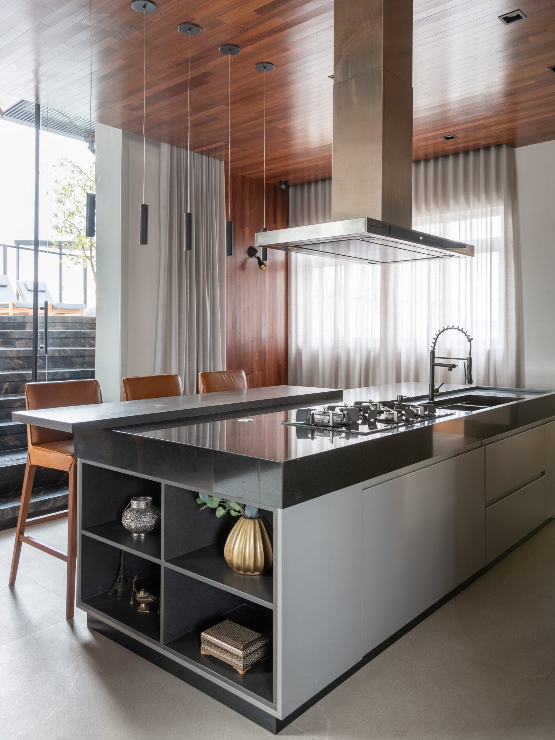 O teto em madeira, combinado ao piso em tom de concreto, trouxe aconchego e sofisticação, reforçando o contraste com elementos mais sóbrios como a escada em pedra Matrix Gold e o tijolinho aparente da cozinha. O décor valoriza peças assinadas, como a icônica poltrona Up de Gaetano Pesce, as mesas Twist e o banco Cheig de Jader Almeida, além dos quadros de Rita Duarte, que dialogam com a atmosfera contemporânea do espaço.