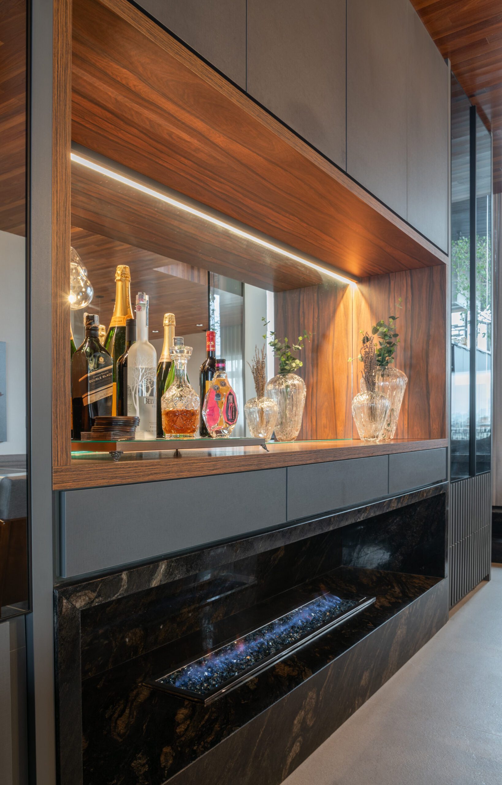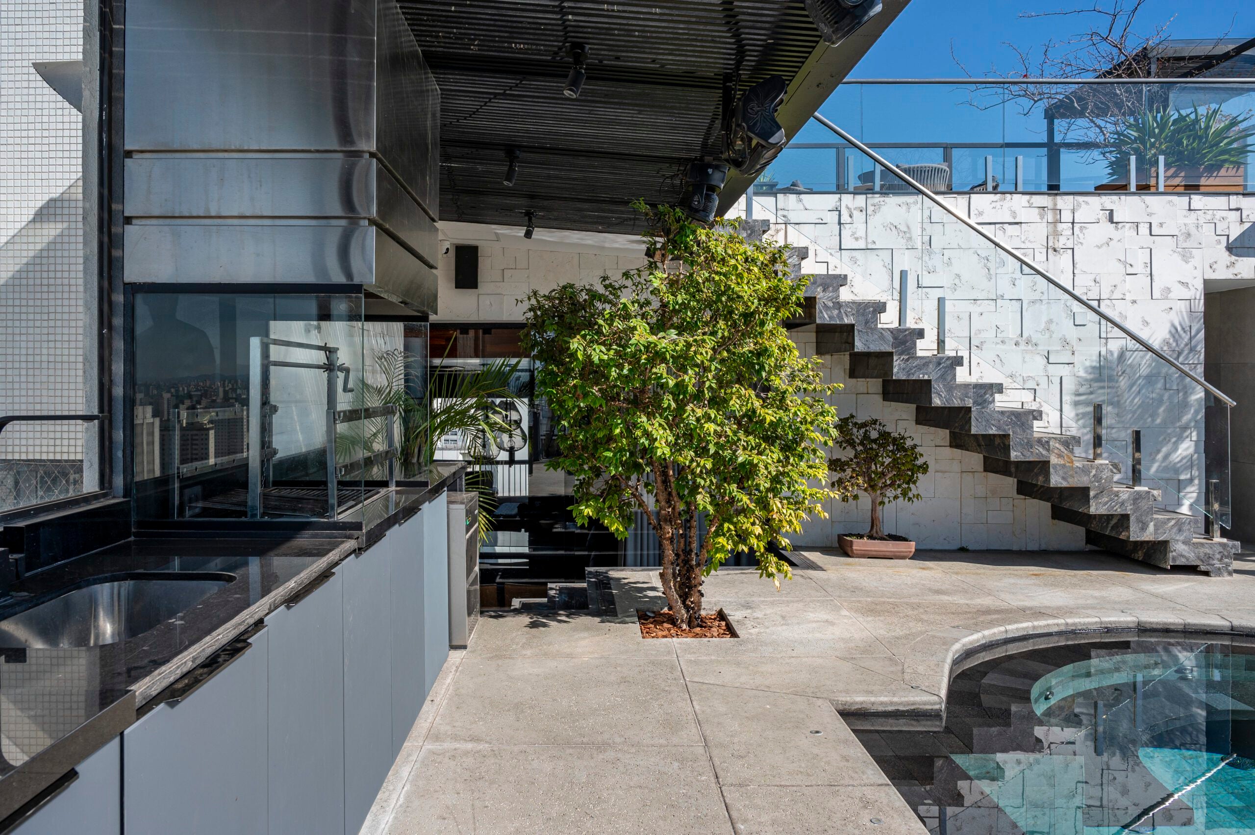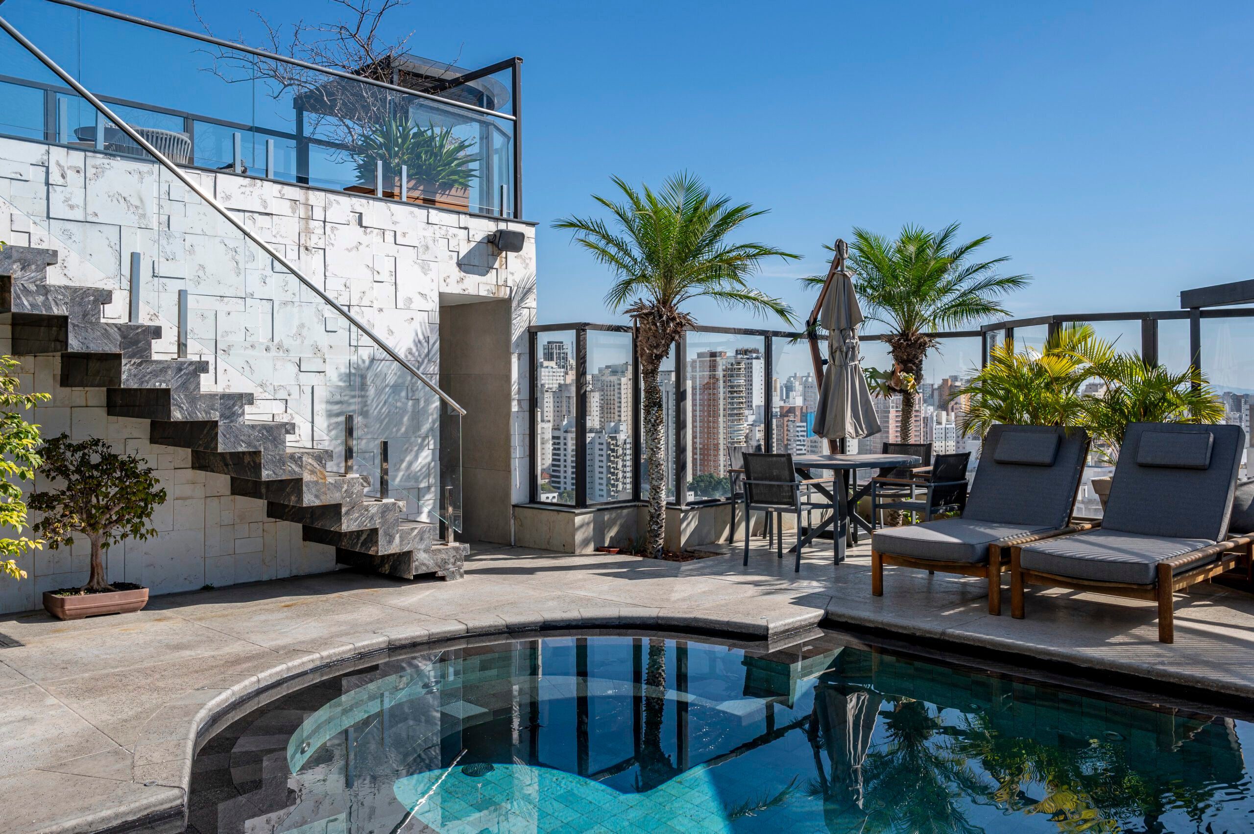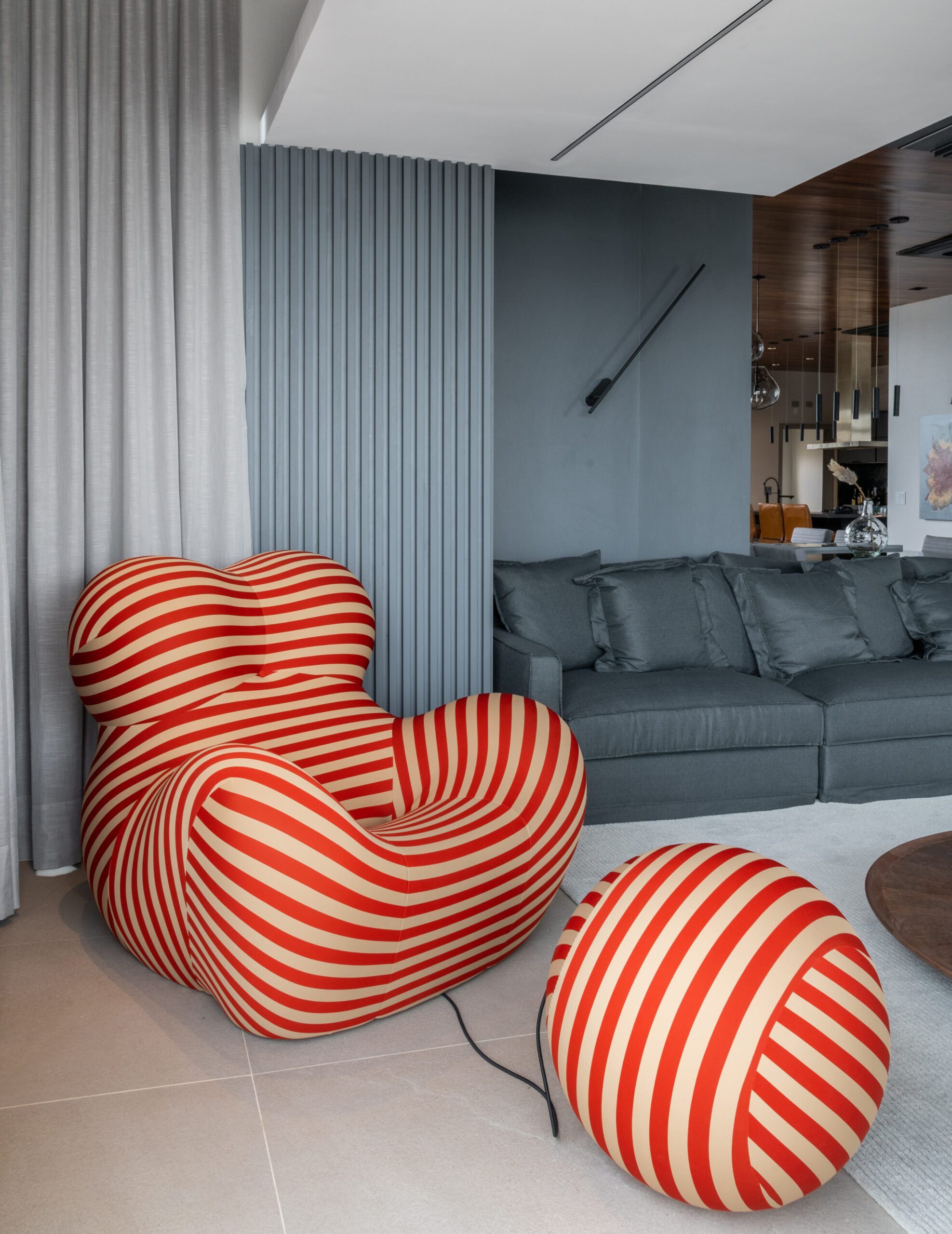 O teto em madeira, combinado ao piso em tom de concreto, trouxe aconchego e sofisticação, reforçando o contraste com elementos mais sóbrios como a escada em pedra Matrix Gold e o tijolinho aparente da cozinha. O décor valoriza peças assinadas, como a icônica poltrona Up de Gaetano Pesce, as mesas Twist e o banco Cheig de Jader Almeida, além dos quadros de Rita Duarte, que dialogam com a atmosfera contemporânea do espaço.