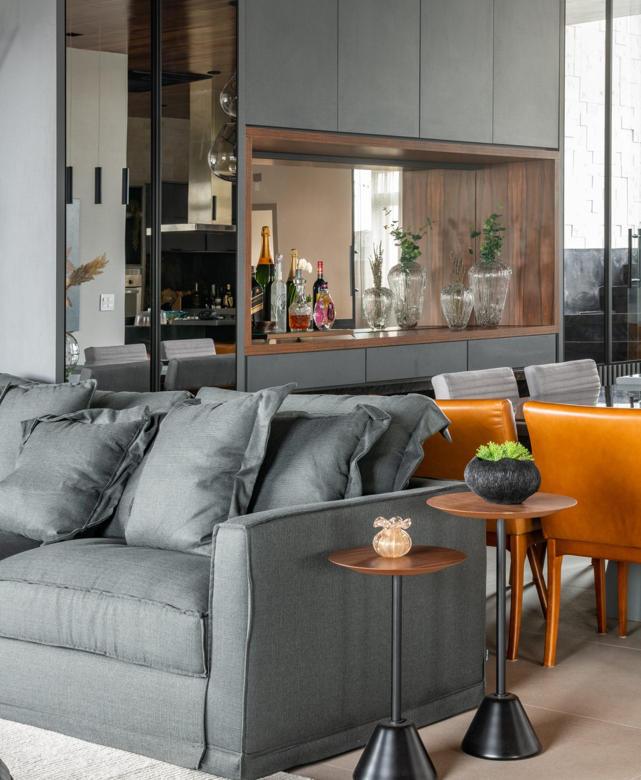 A reorganização do layout foi fundamental: a sala de jantar foi reposicionada, dando espaço para que a brinquedoteca ganhasse lugar no antigo ambiente de refeições, delimitada por uma porta de espelho que amplia a sala e garante flexibilidade entre o convívio familiar e a recepção de visitas. Muitos móveis foram reaproveitados e ressignificados, como a cristaleira da sala de jantar, que se transformou em parte do espaço infantil com novo acabamento, e a mesa de jantar, que recebeu apenas cadeiras novas. O reuso foi um dos princípios do projeto, preservando investimentos já feitos e revelando novas possibilidades por meio da envelopagem de móveis e revestimentos.