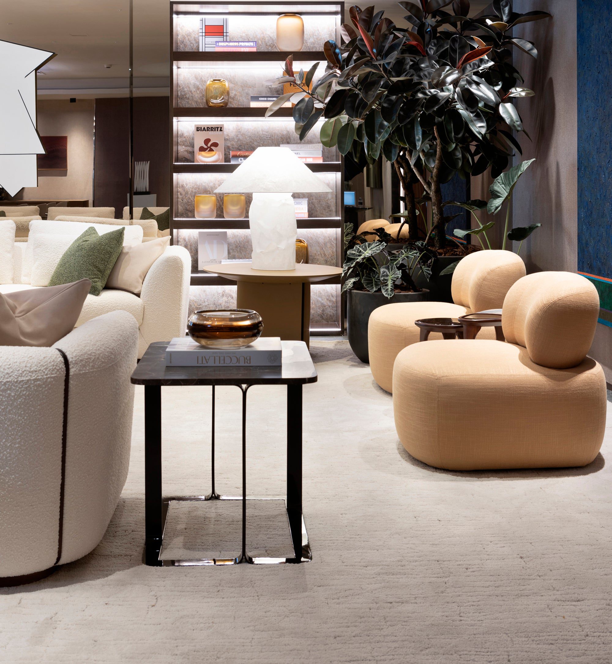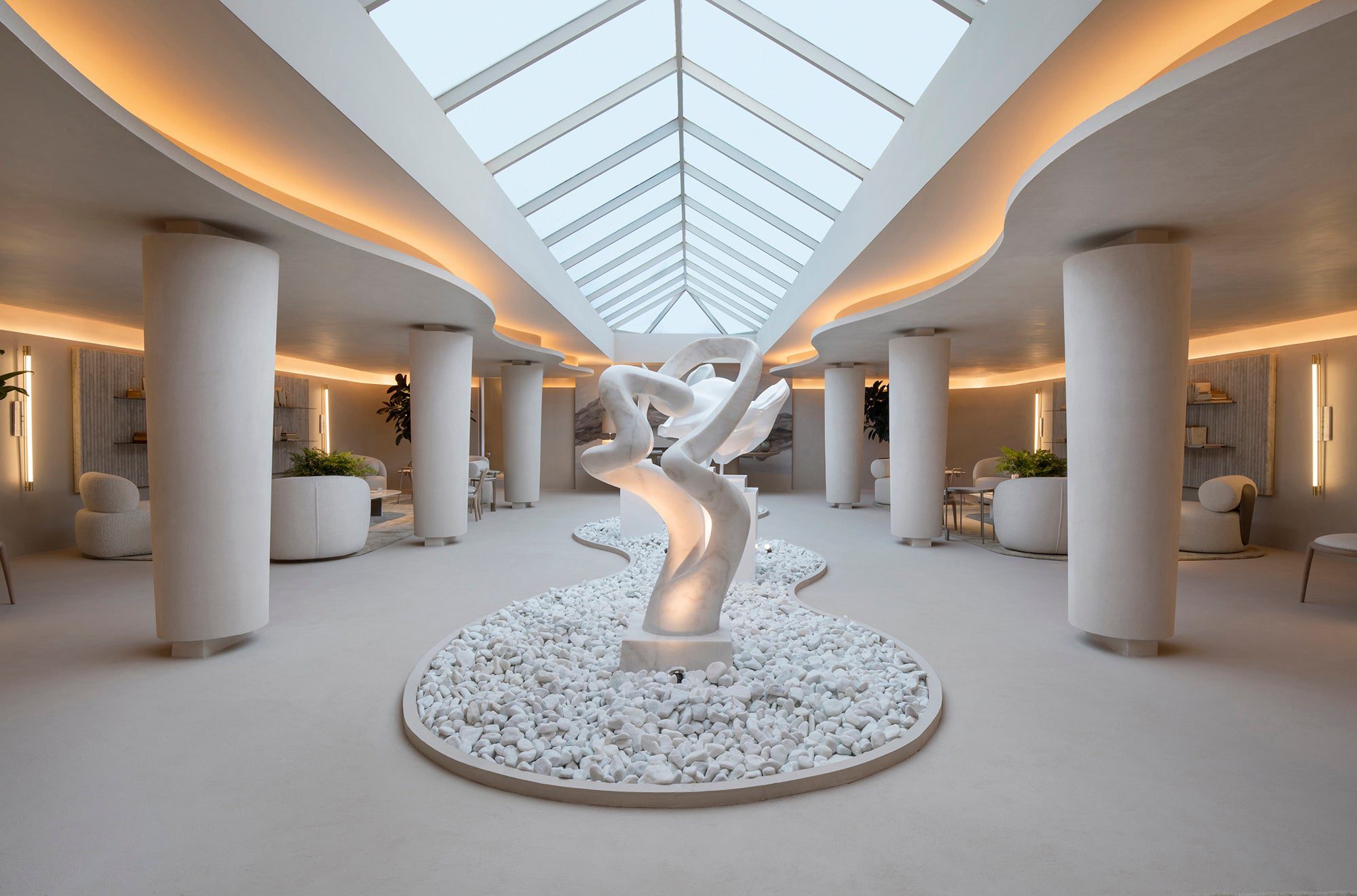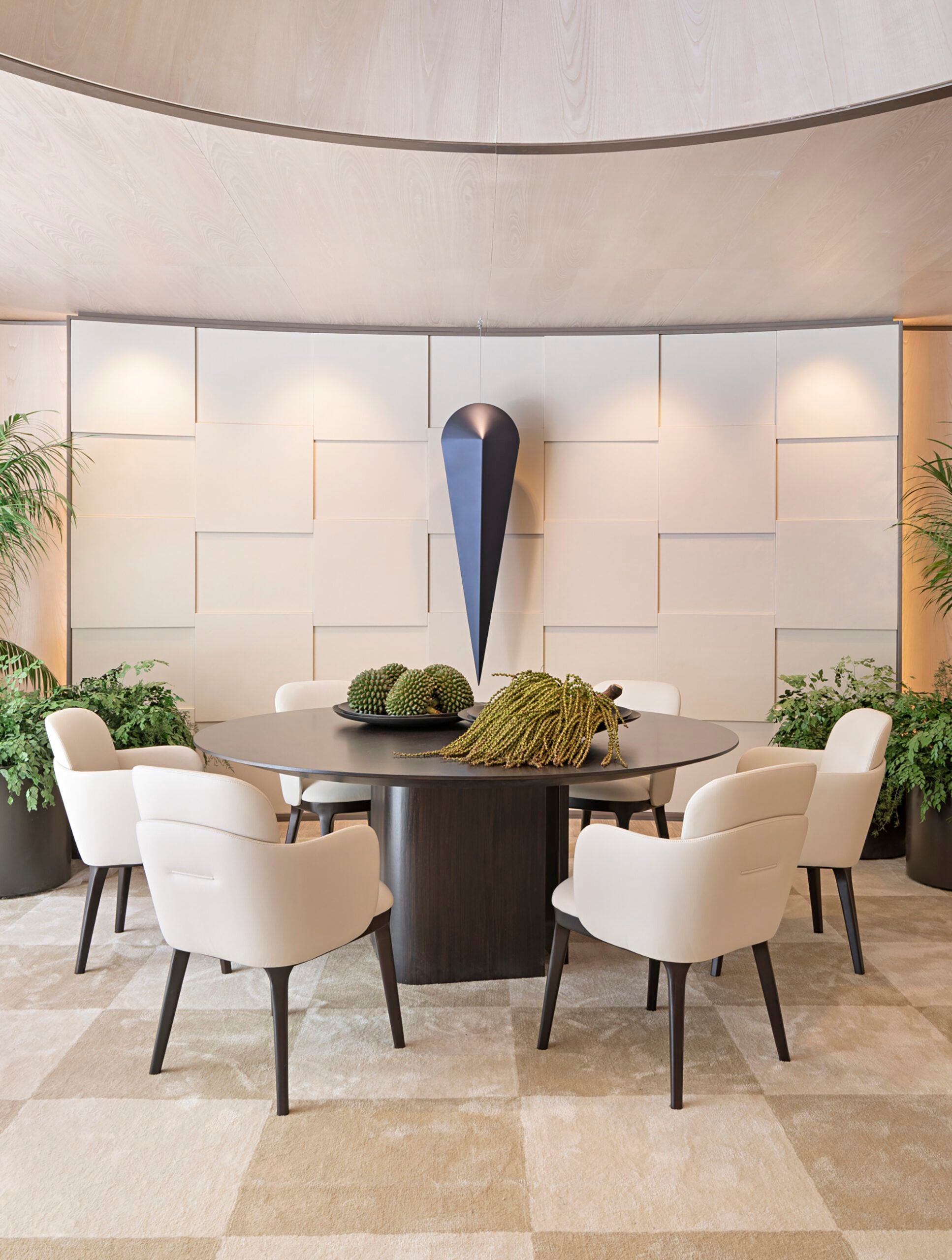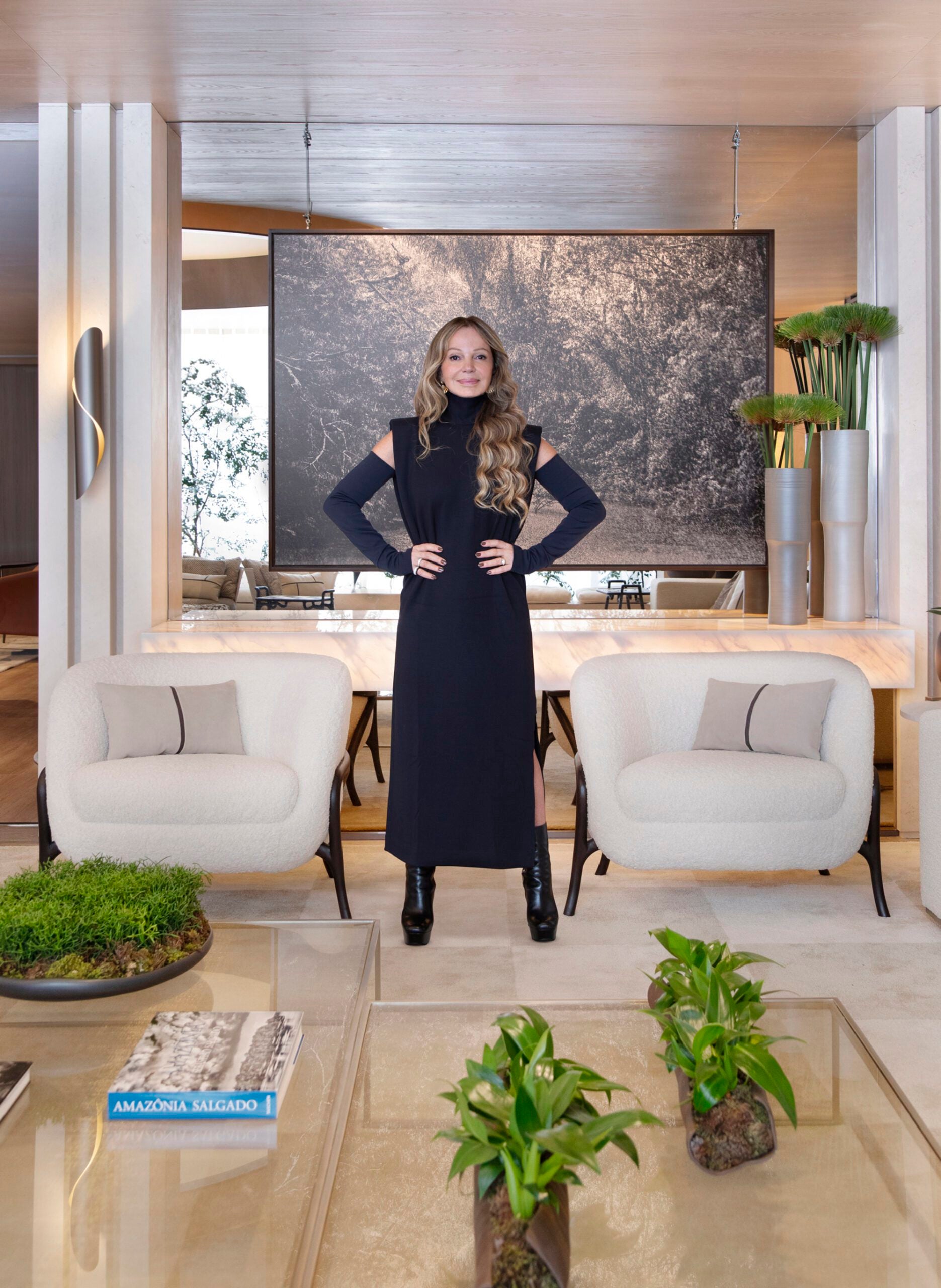 Com tons neutros e materiais naturais, o lounge de Debora Aguiar integra arte e design em um espaço sofisticado e acolhedor. A cúpula central, inspirada nas aldeias indígenas e na obra de Sebastião Salgado, simboliza conexão e ancestralidade, enquanto esculturas e fotografias dialogam harmoniosamente com o mobiliário Artefacto.