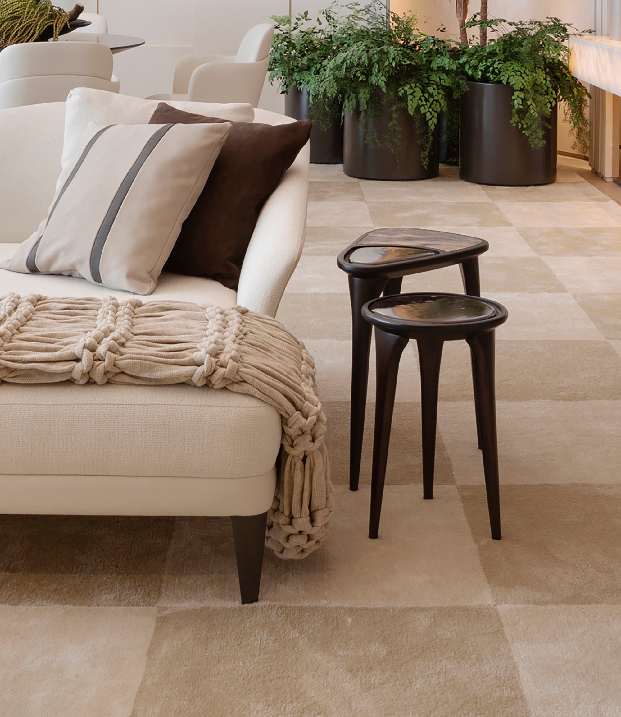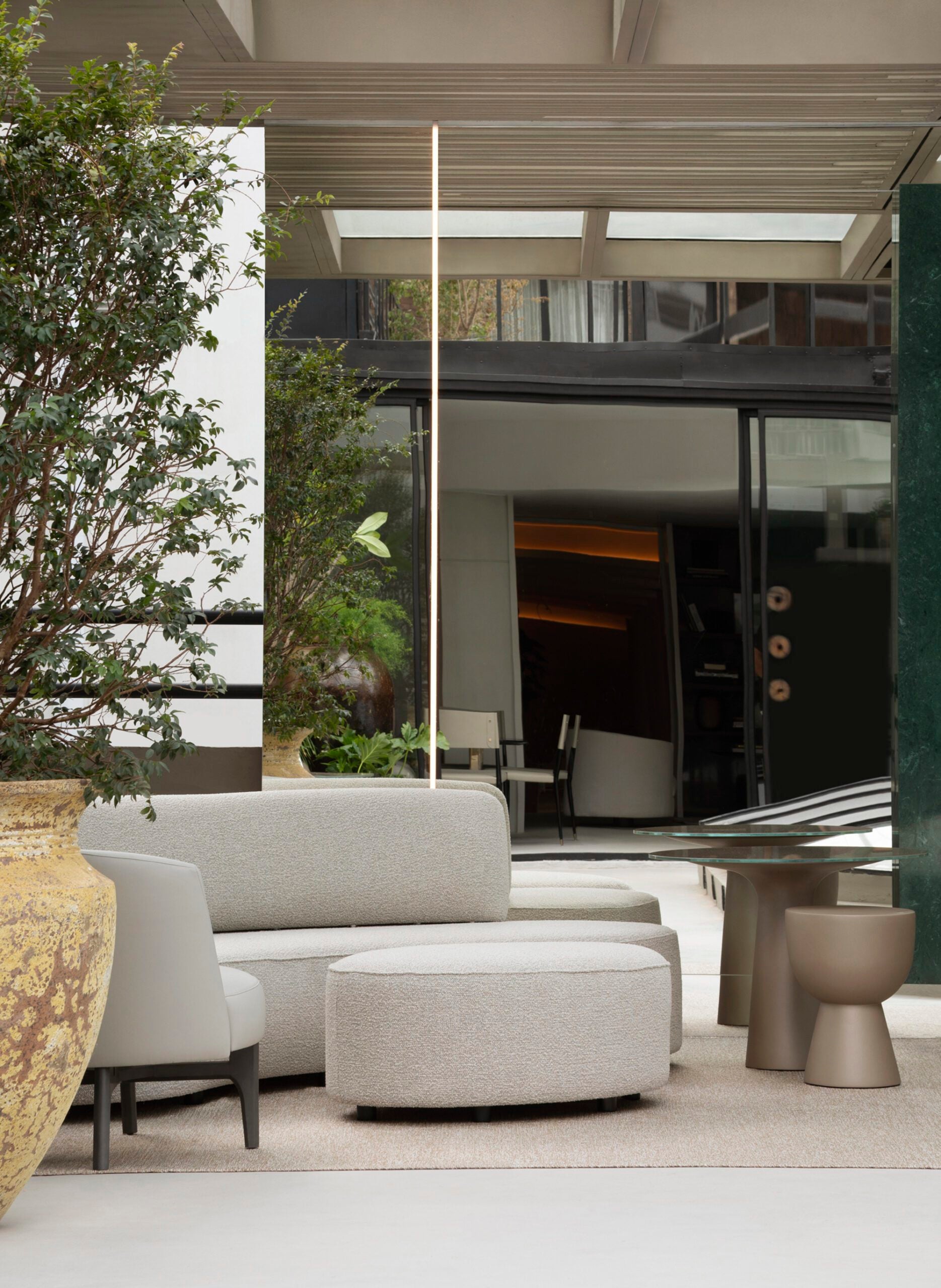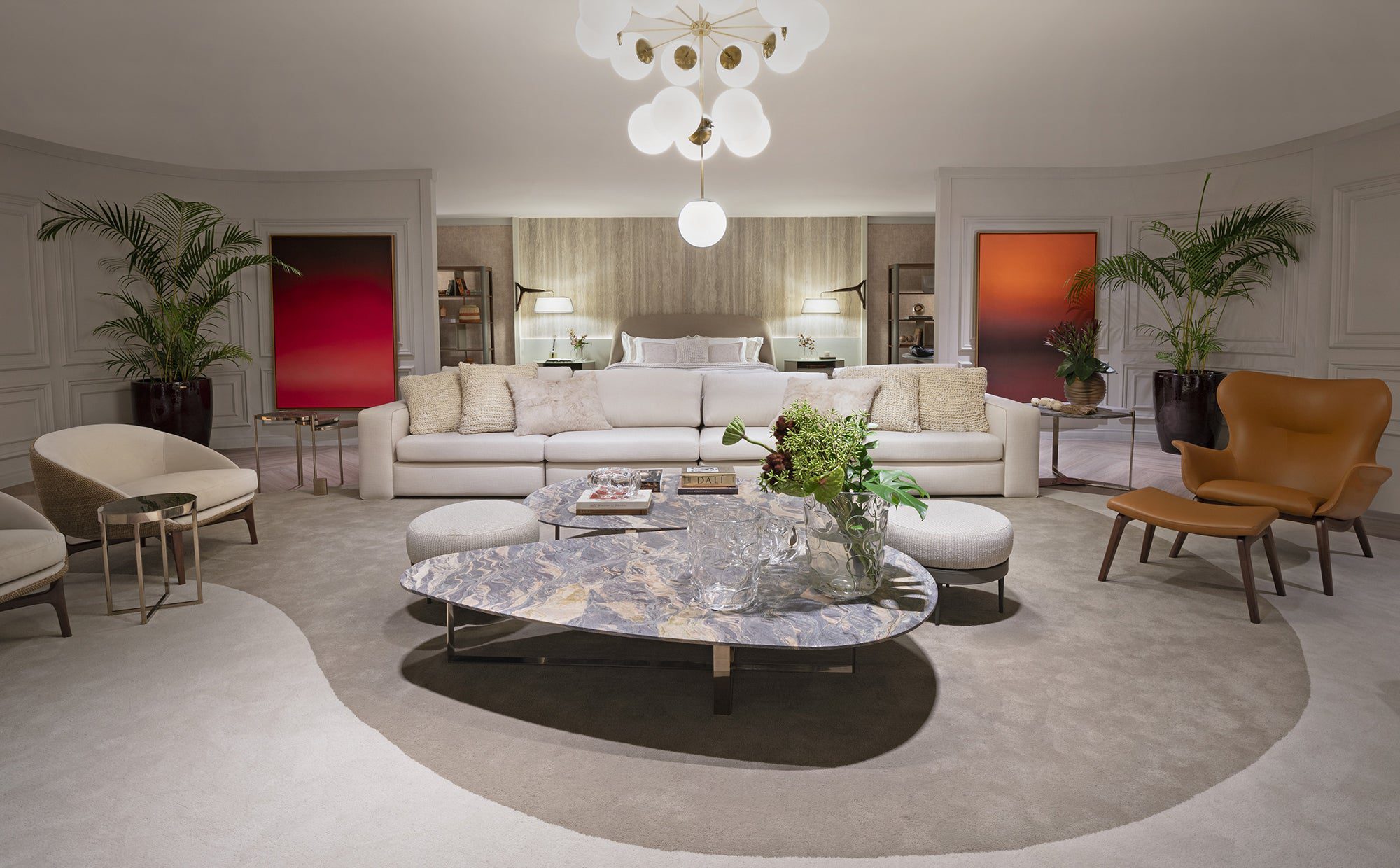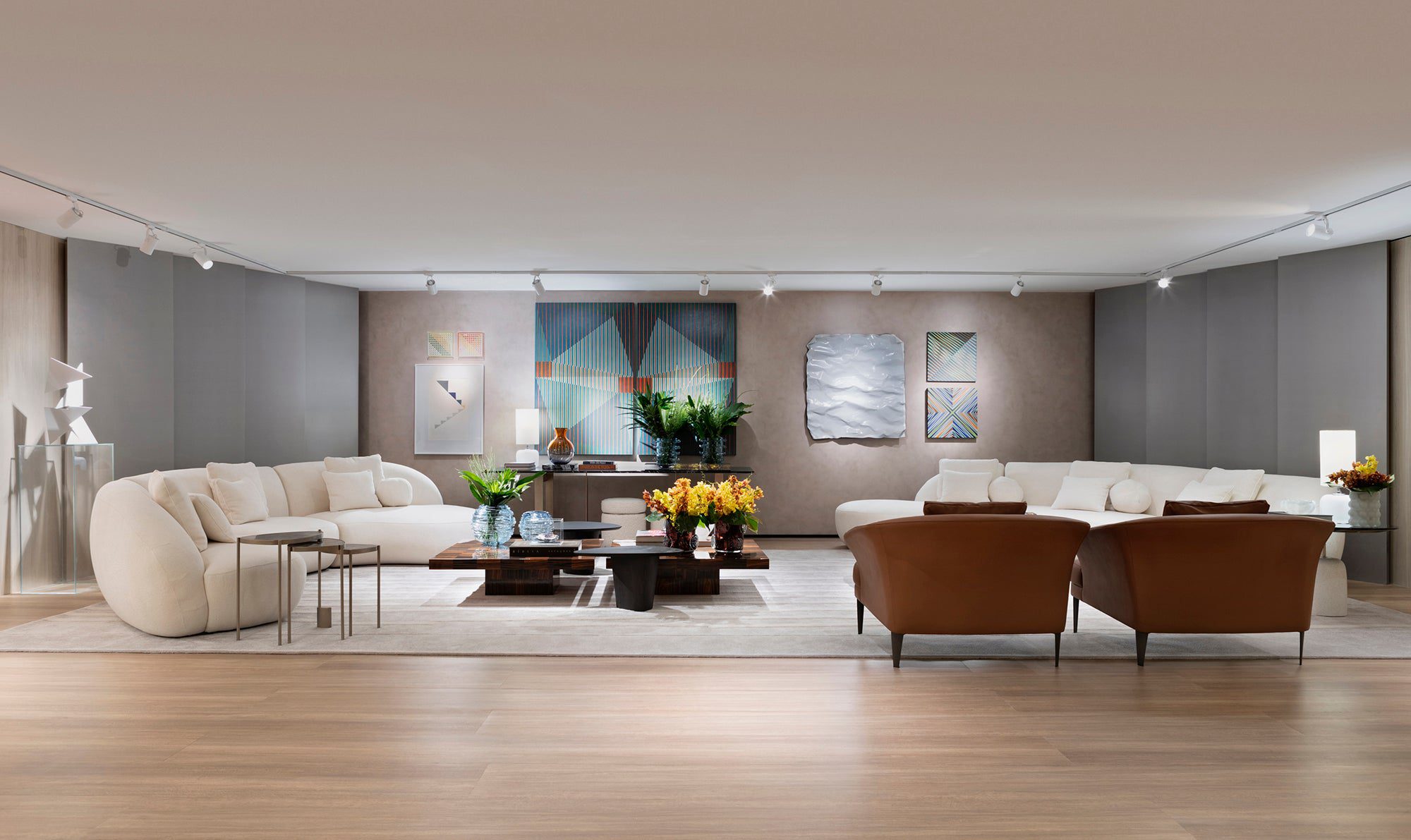 Com tons neutros e materiais naturais, o lounge de Debora Aguiar integra arte e design em um espaço sofisticado e acolhedor. A cúpula central, inspirada nas aldeias indígenas e na obra de Sebastião Salgado, simboliza conexão e ancestralidade, enquanto esculturas e fotografias dialogam harmoniosamente com o mobiliário Artefacto.
