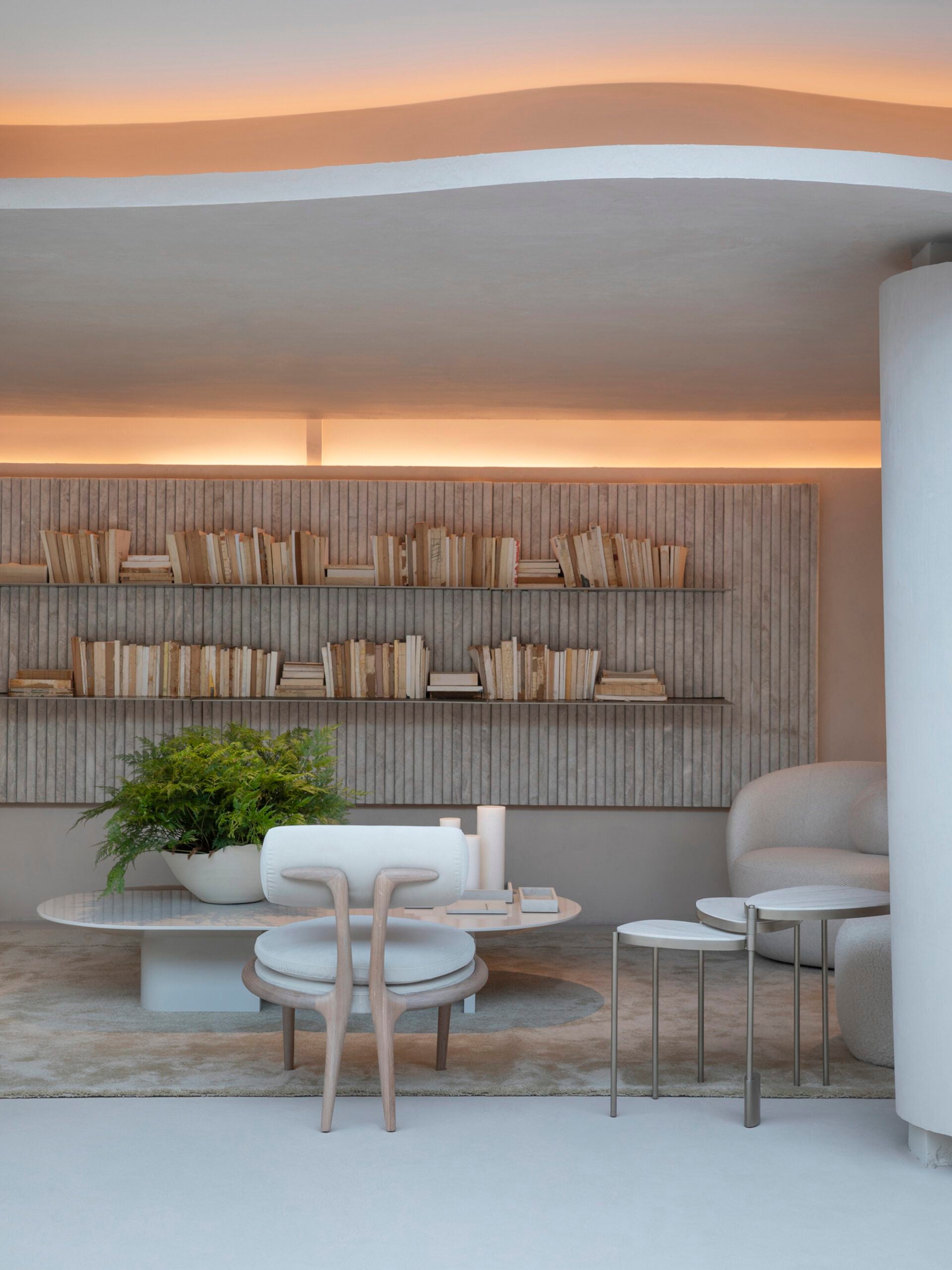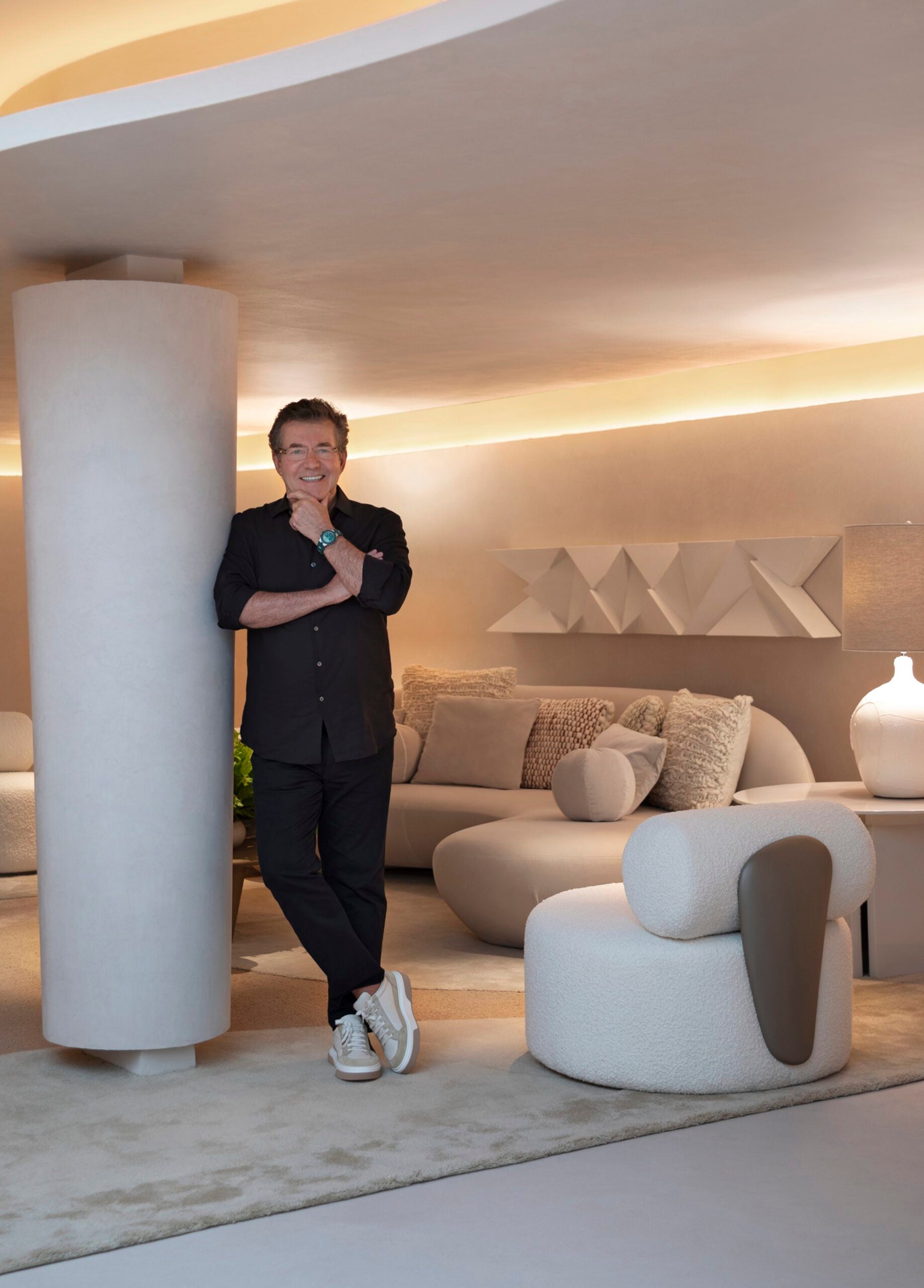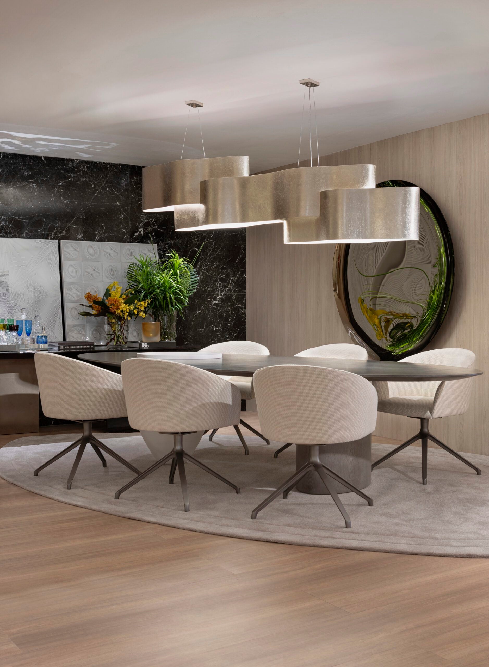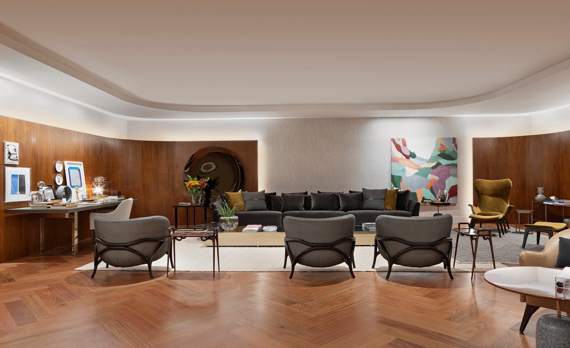 Inspirado no Modernismo, Roberto Migotto assina um ambiente de formas fluidas e estética clean. O forro curvo e a luz natural criam um jogo artístico de sombras, enquanto amplas paredes exibem obras de arte. Móveis elegantes garantem conforto sem comprometer a harmonia visual.