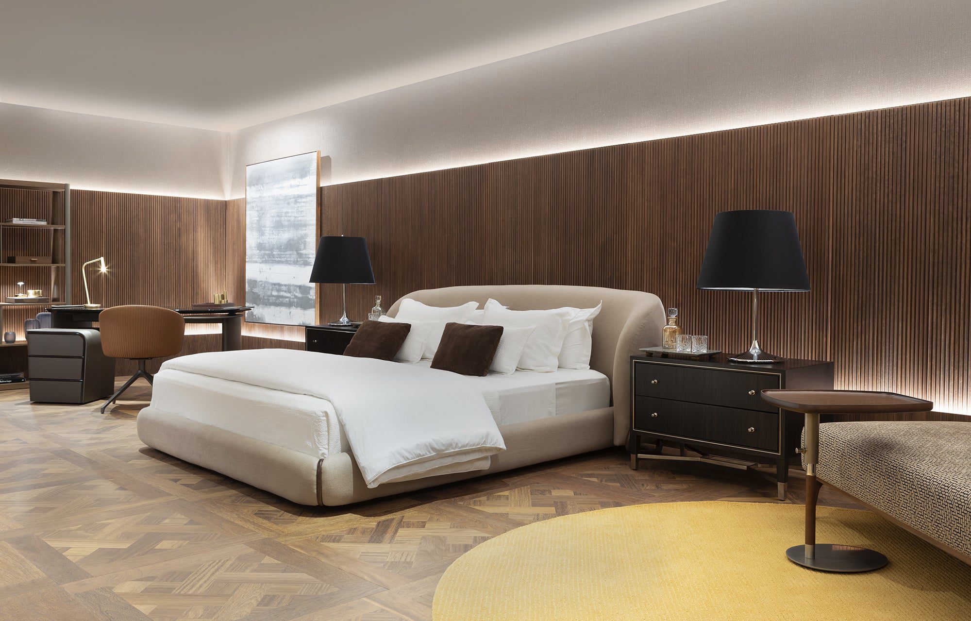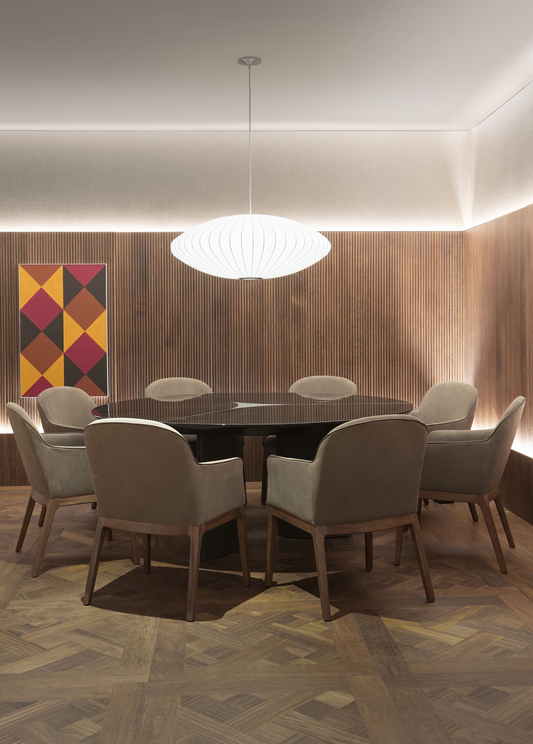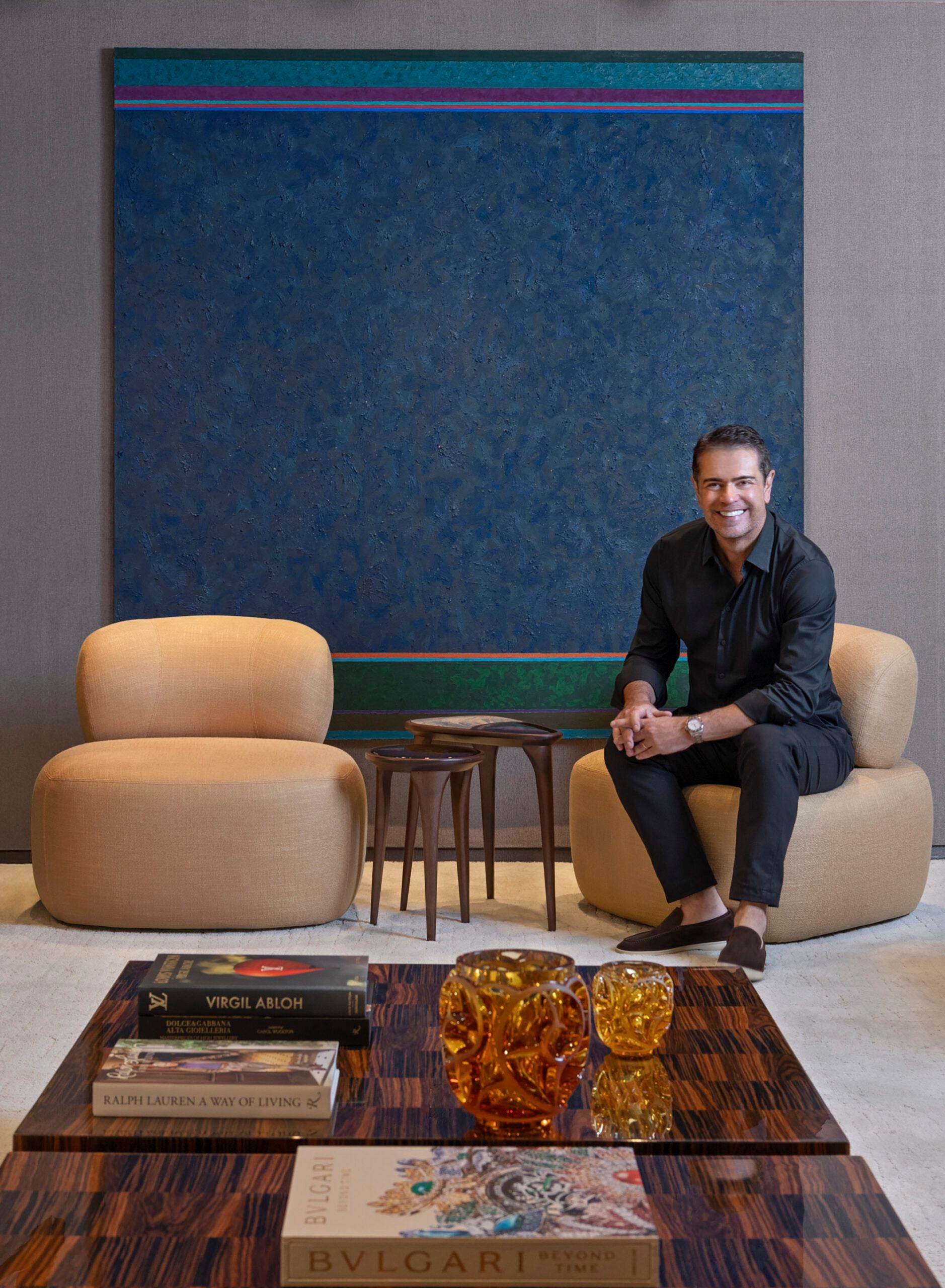 Fábio Morozini cria um ambiente que equilibra o olhar curatorial com o conforto de um lar. Guiado pelo conceito “Viver com Arte”, ele distribui obras de artistas renomados e emergentes por todo o espaço. Materiais naturais e cores neutras formam a base, com revestimentos em madeira e tecidos como linho e camurça. A iluminação valoriza as obras sem competir com elas, e peças da Artefacto, como a mesa Gioco, acrescentam sofisticação artesanal.