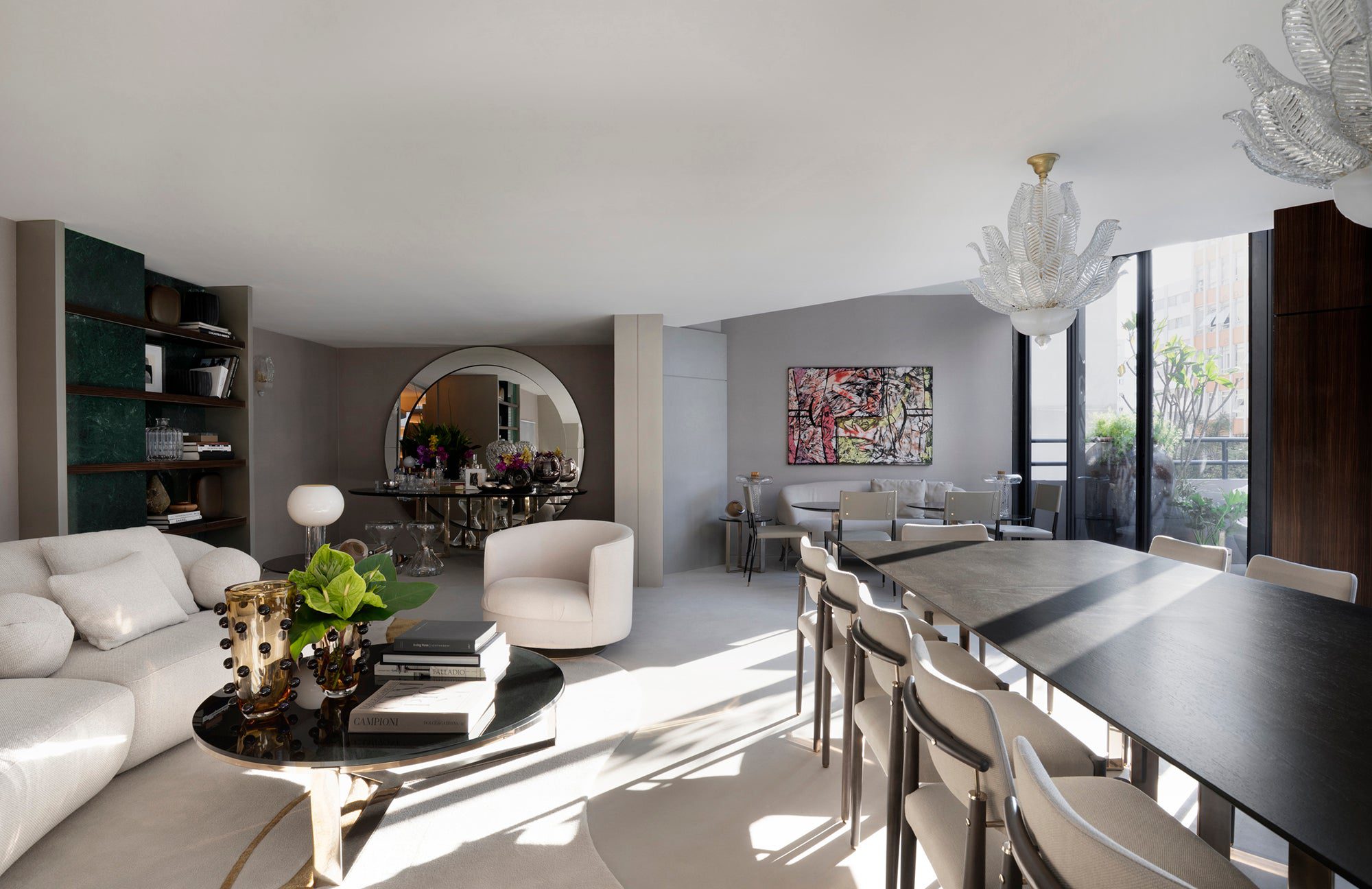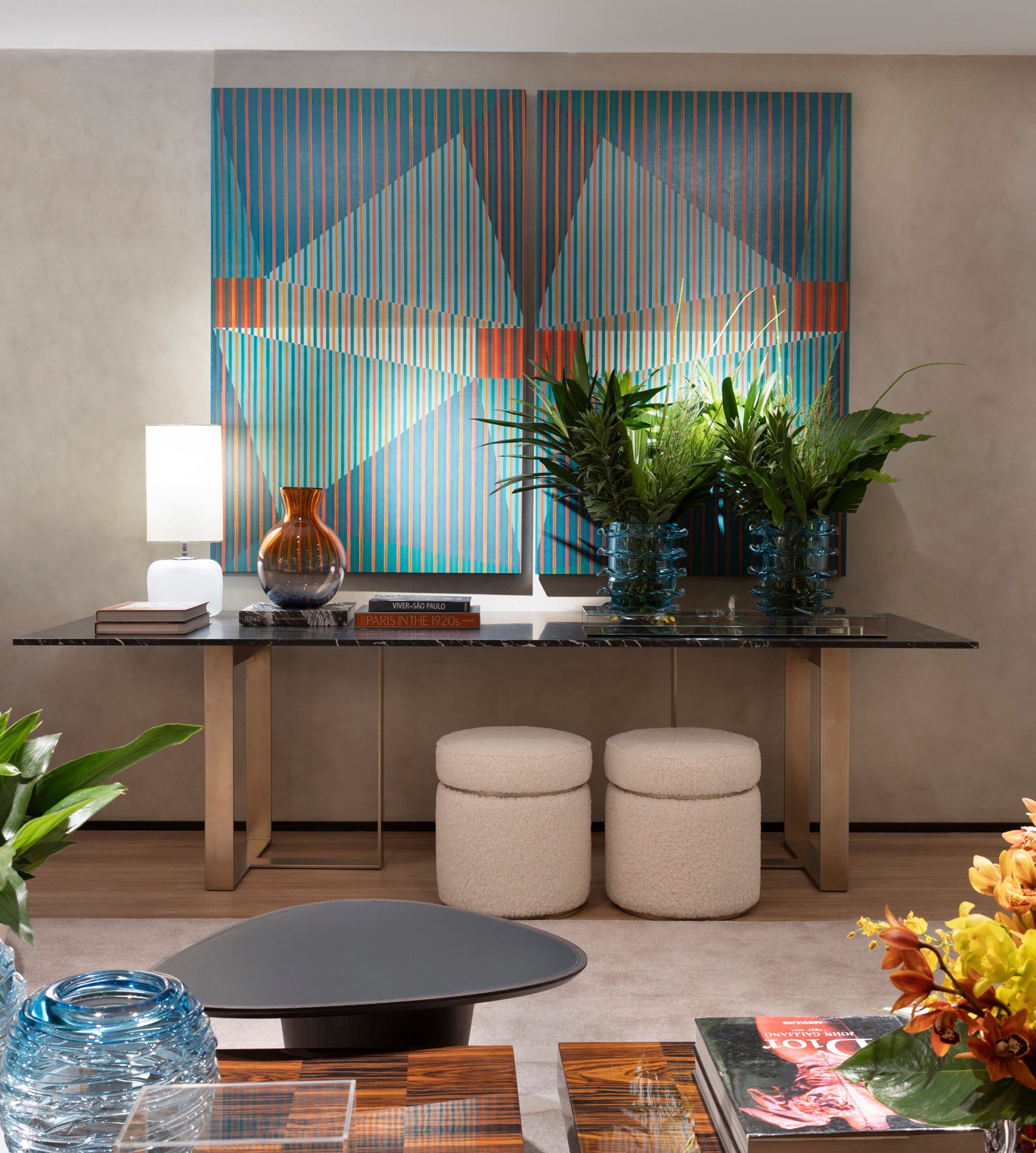 Laura Rocha cria um ambiente onde arquitetura e arte se fundem como em um filme, destacando cada obra exposta. Influências do Mid-Century Modern e Hollywood Regency resultam em uma mistura de clássico e moderno, com linhas limpas e toques de glamour vintage. Cores vibrantes contrastam com uma base neutra, enquanto o mobiliário da Artefacto e a iluminação destacam texturas refinadas.