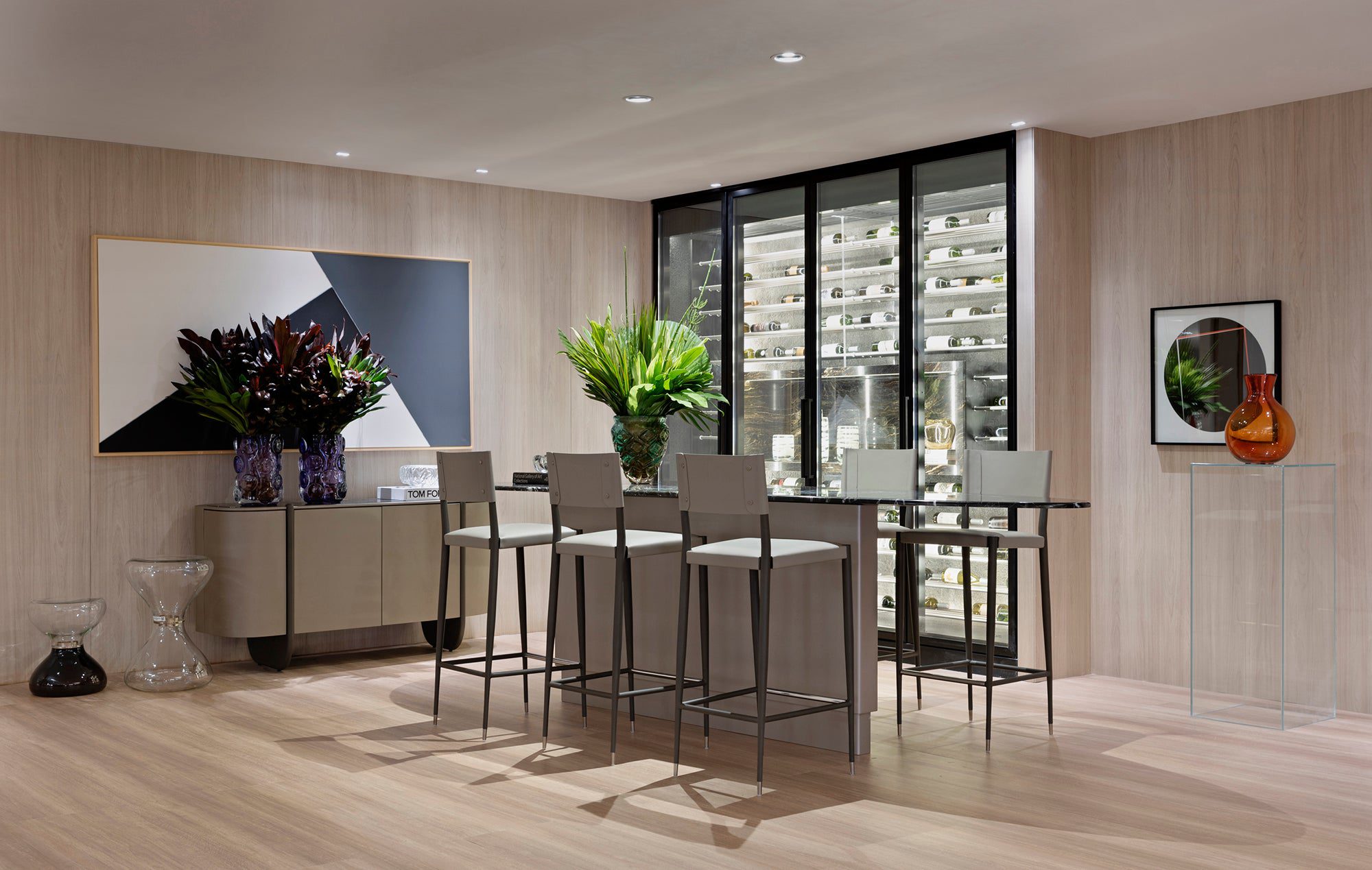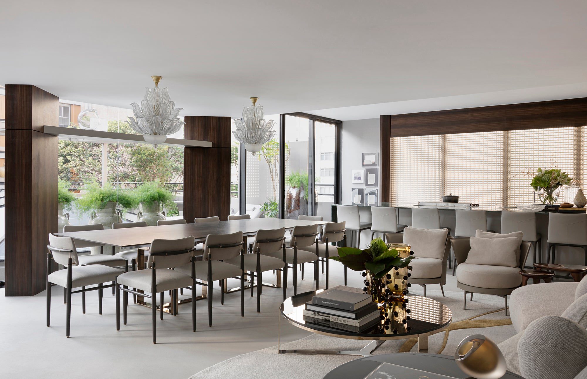 O projeto de Andrea Bugarib e Betina Barcellos, da In House Arquitetura e Design, integra arte, mobiliário e arquitetura, criando um ambiente dinâmico e sofisticado. Obras de arte convivem com móveis Artefacto, tornando o mobiliário parte da composição. O layout, com um bar central, favorece a interação social e conecta áreas de estar e uma área externa. O uso de materiais contemporâneos e texturas cria profundidade, fazendo da arte uma parte orgânica do dia a dia.