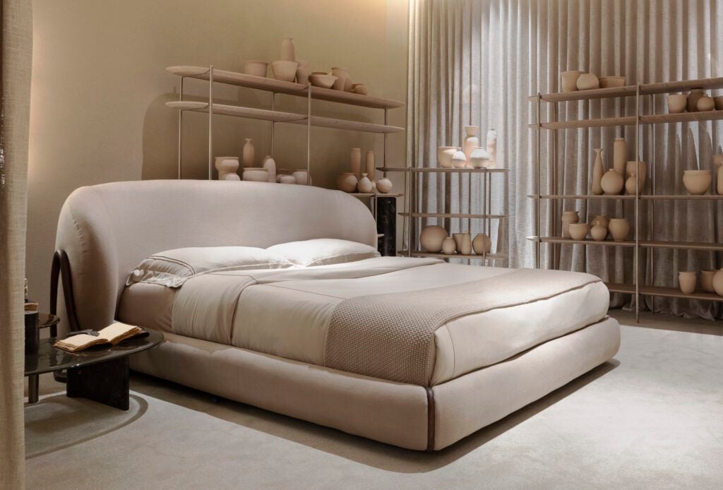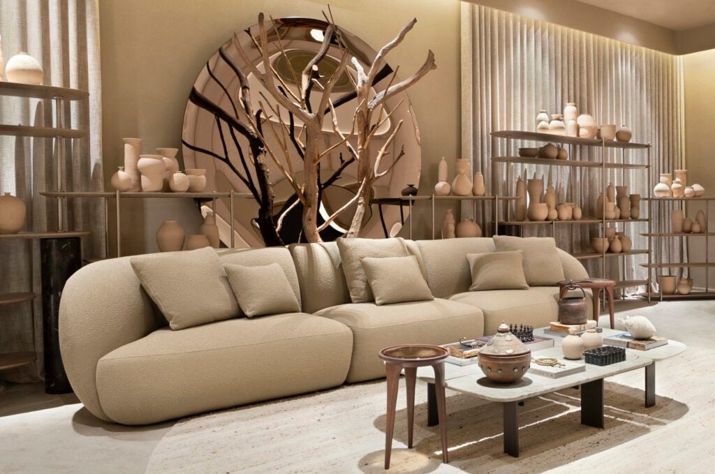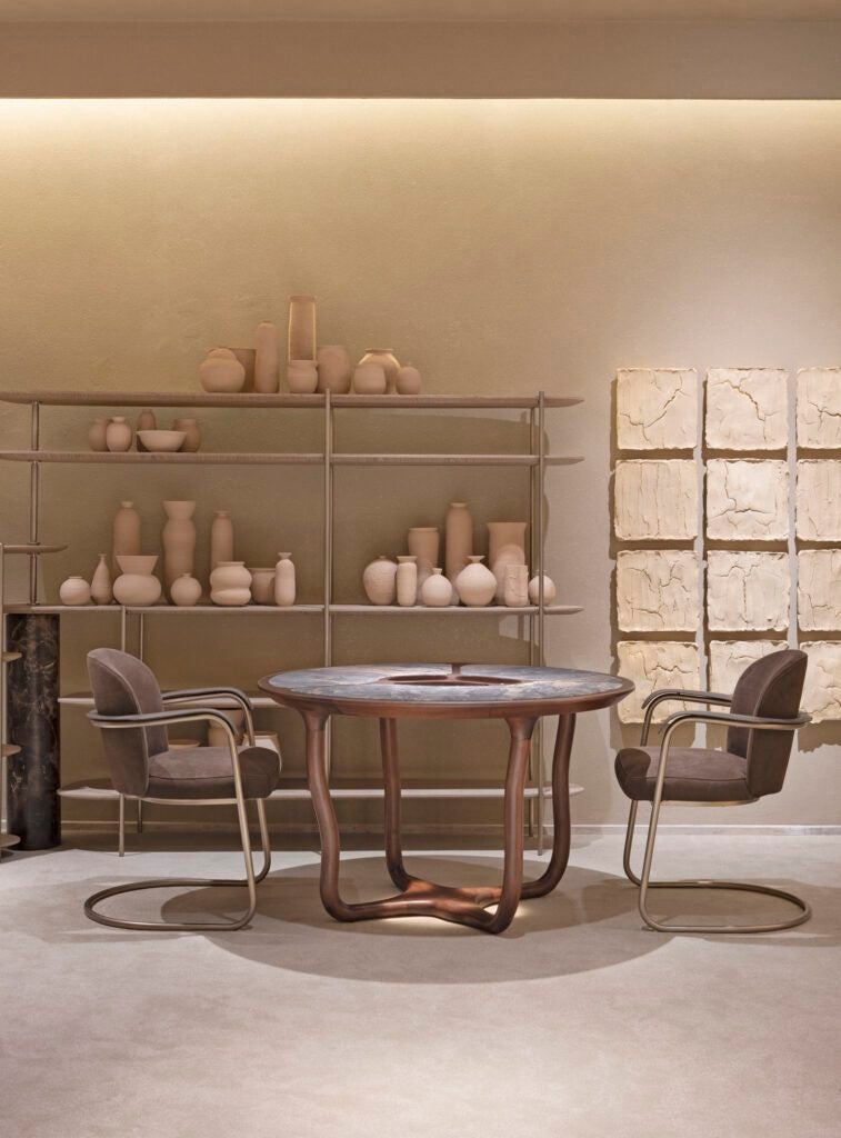 Os móveis da Artefacto se tornam protagonistas na materialização desse conceito. Seu design orgânico e a precisão dos acabamentos conferem ao ambiente a densidade poética necessária para sustentar a narrativa proposta pelo escritório. Entre as escolhas, as estantes Apex se impõem pela força visual, em equilíbrio com a moldura Aka, que assume a simbologia de portais para o sol e a lua. Elementos que reforçam a busca por uma conexão ancestral e espiritual, transformando o espaço em uma jornada estética e emocional.